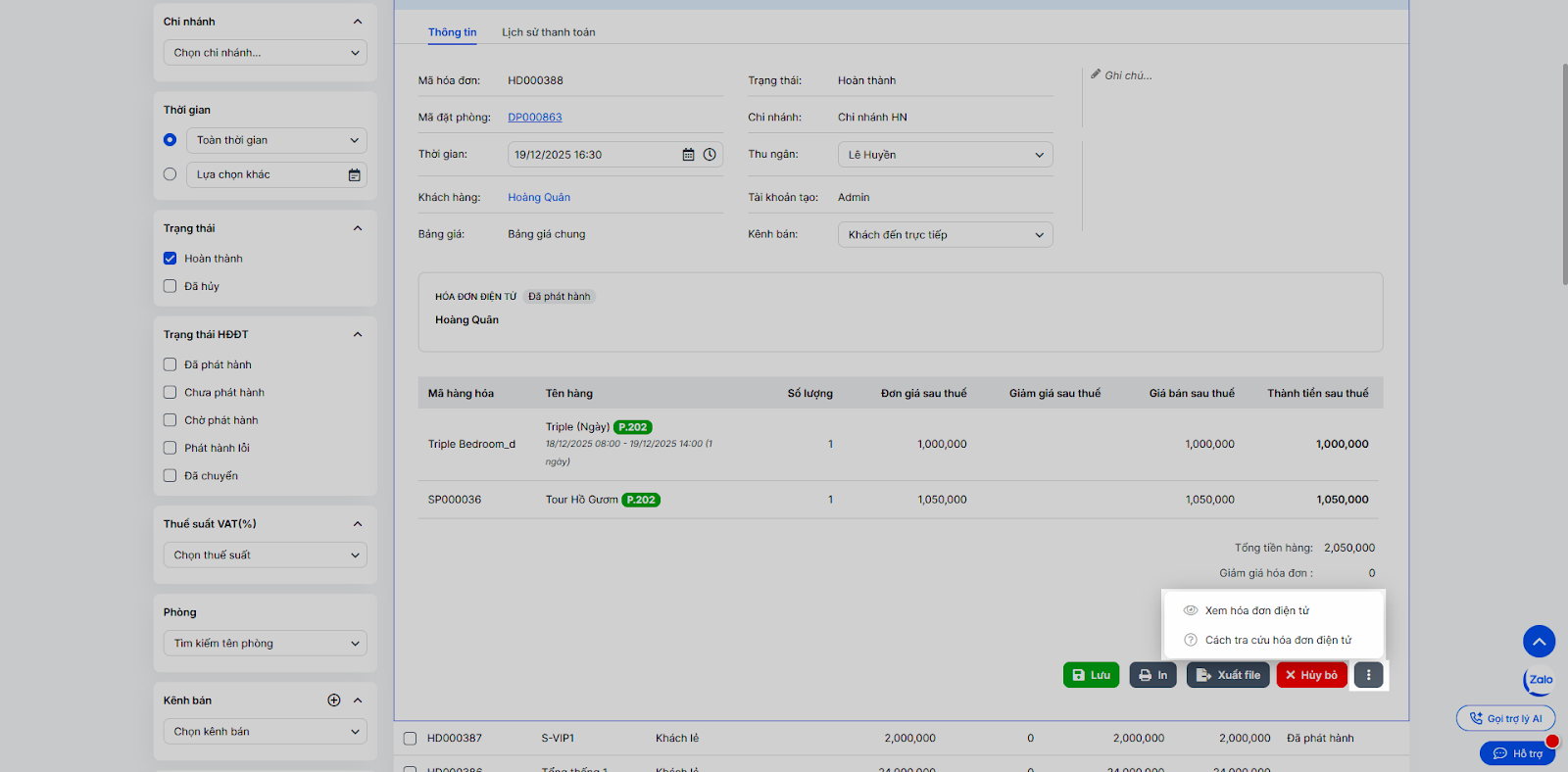 - Tình huống: Sau khi đã phát hành hoặc chuyển hóa đơn cho khách lưu trú, bạn cần theo dõi trạng thái của các HĐĐT, xem lại bản thể hiện hóa đơn để đối chiếu, hoặc lấy m&ã; tra cứu để gửi cho khách hàng tự kiểm tra.