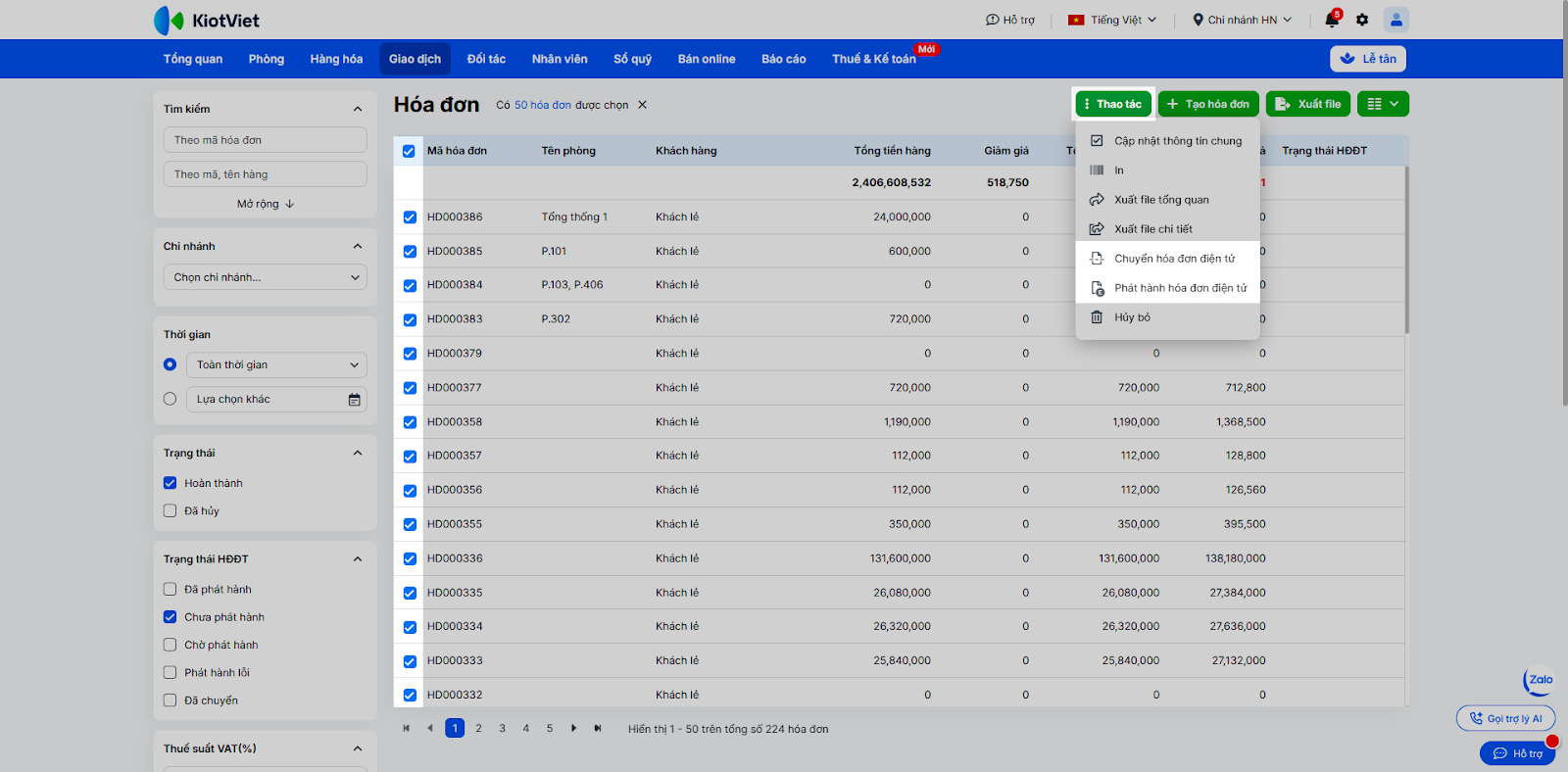 - Bạn nhấn Thao tác và chọn Chuyển hoặc Phát hành hóa đơn điện tử (tối đa 50 hóa đơn/lần) trên 1 chi nhánh.