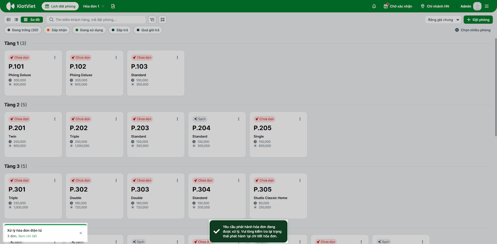 - Tình huống: Khi bạn không sử dụng tính năng phát hành tự động, hoặc cuối ca làm việc bạn muốn xử lý (phát hành/chuyển) đồng thời nhiều hóa đơn cho các giao dịch trả phòng đã hoàn tất trong ngày.