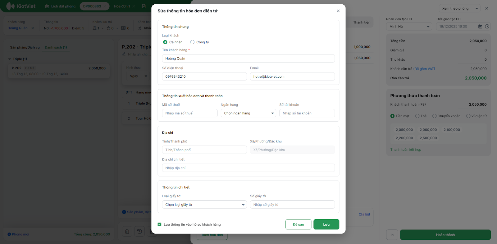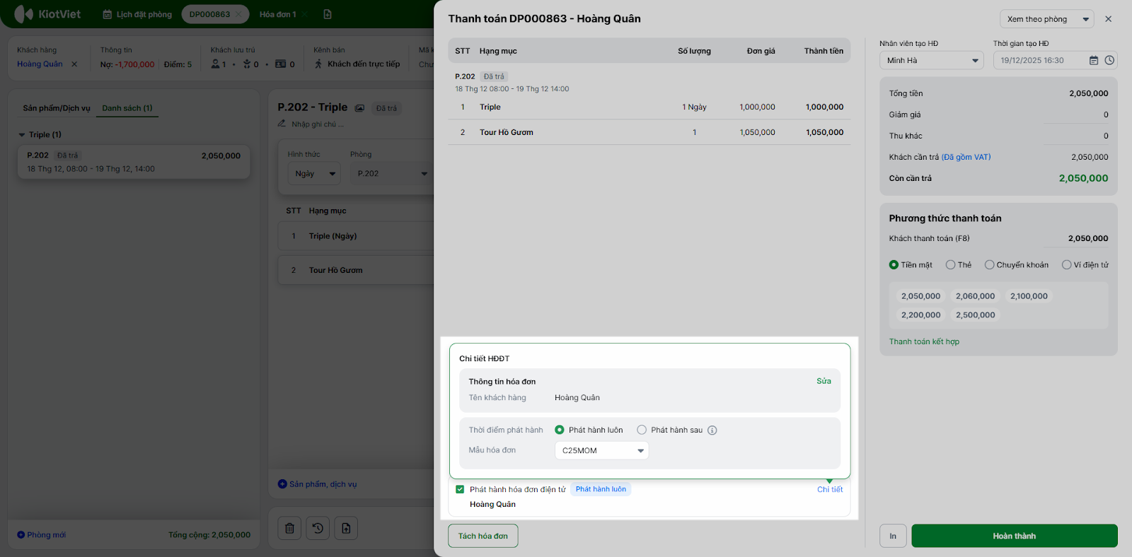 - Tình huống: Khi bạn đang thực hiện thủ tục trả phòng (check-out) cho khách tại quầy lễ tân, bạn muốn hệ thống tự động phát hành hóa đơn điện tử cho khách ngay sau khi thanh toán thành công để tiết kiệm thời gian chờ đợi của khách lưu trú.