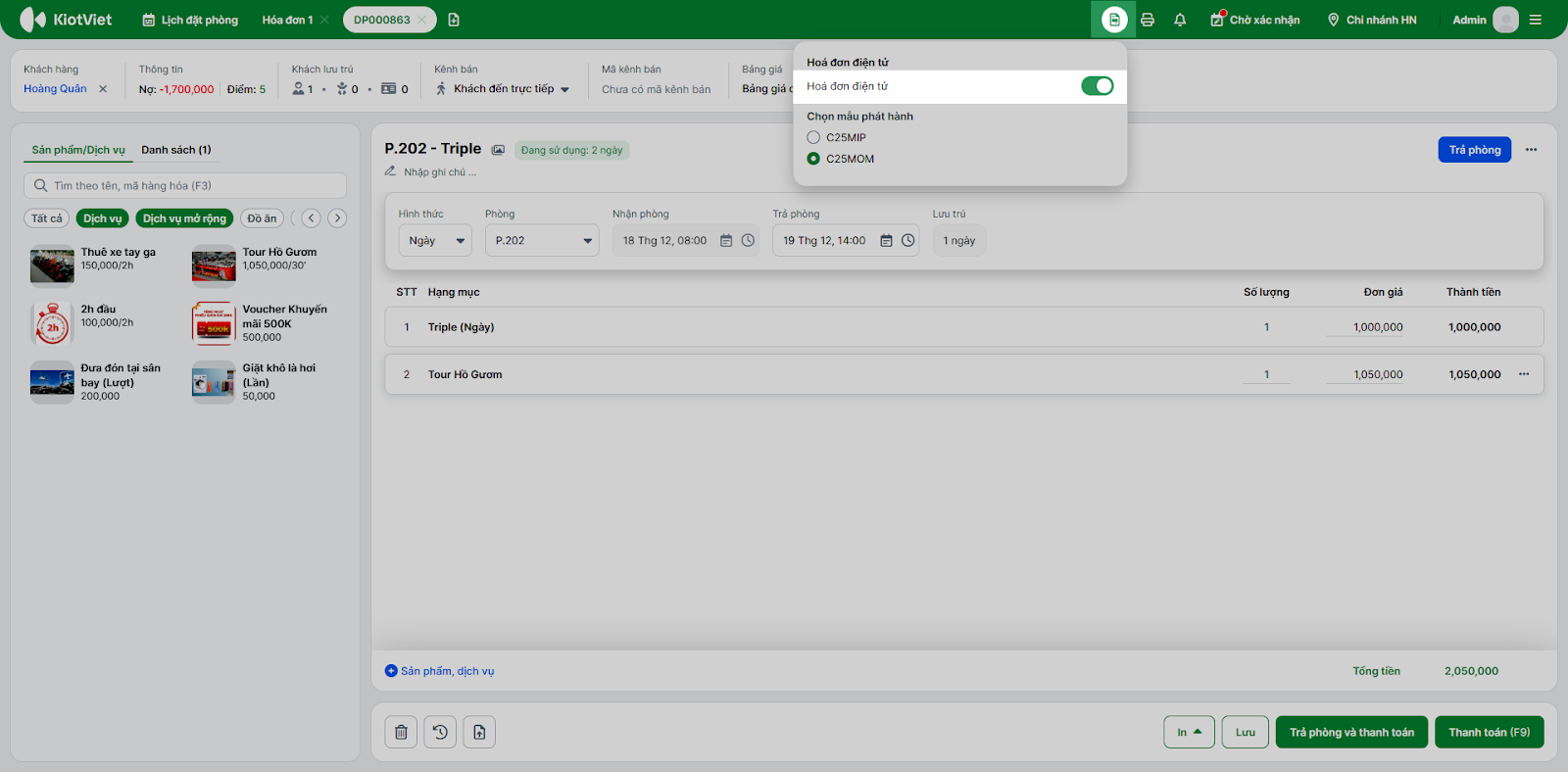 Tình huống: Khi bạn đang sử dụng ứng dụng KiotViet Hotel để thực hiện thủ tục thanh toán trả phòng cho khách ngay tại sảnh hoặc trong trường hợp di chuyển, bạn muốn hóa đơn điện tử được phát hành tự động ngay khi giao dịch hoàn tất.