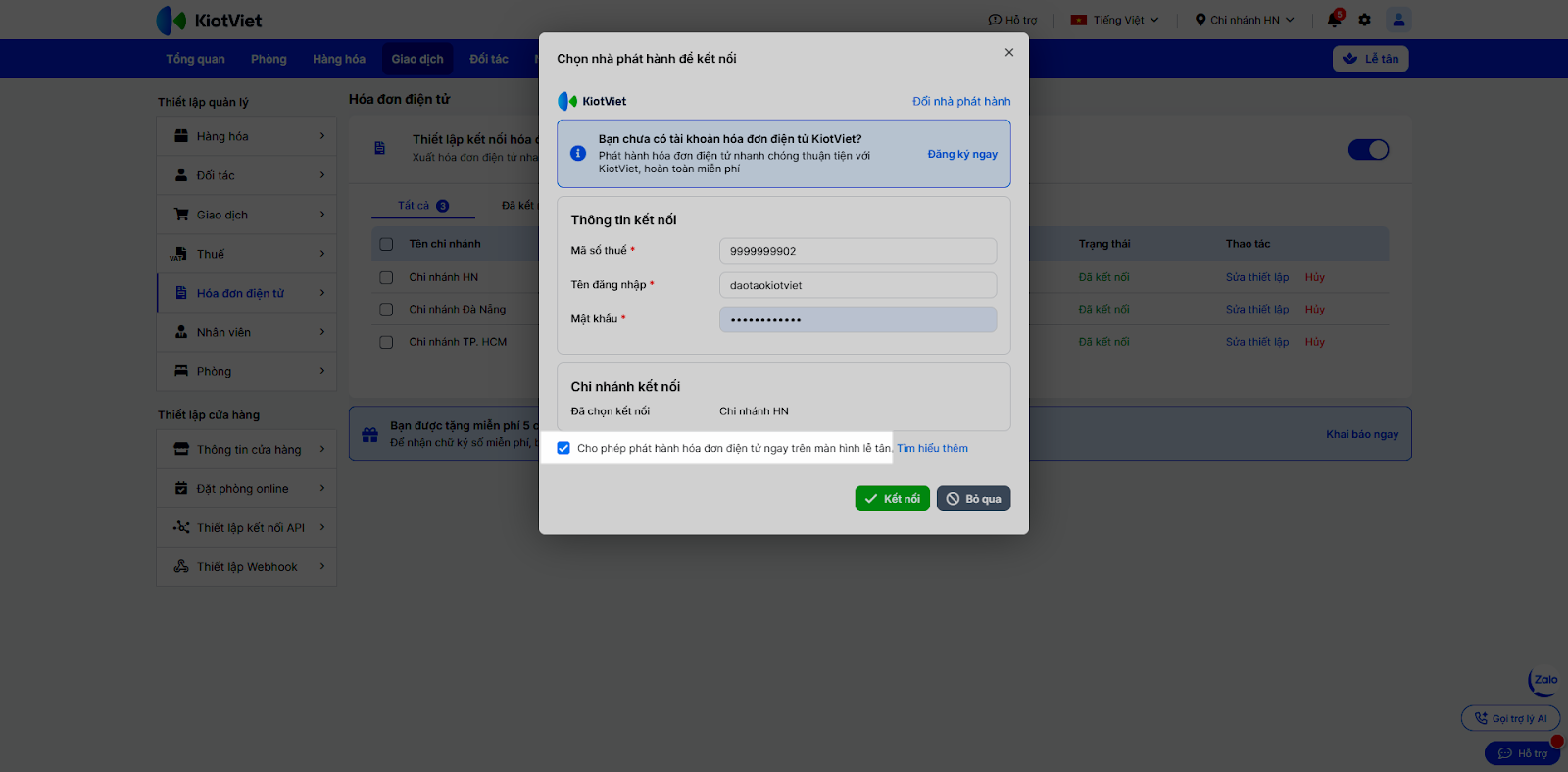 - Khi bạn thực hiện thanh toán thành công cho một hóa đơn, KiotViet sẽ tự động gửi thông tin sang hệ thống của nhà cung cấp HĐĐT để phát hành hóa đơn.