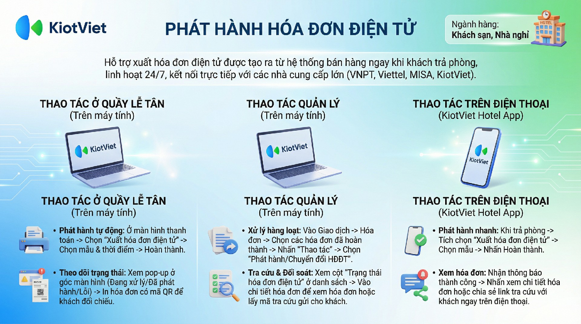 Tính năng Phát hành Hóa đơn điện tử (HĐĐT) trên KiotViet là giải pháp hỗ trợ khách sạn, nhà nghỉ phát hành HĐĐT khởi tạo từ máy tính tiền, tuân thủ theo các quy định pháp lý hiện hành. KiotViet cho phép kết nối trực tiếp với các nhà cung cấp HĐĐT lớn (như KiotViet KV-EINVOICE, MISA, VIETTEL, VNPT), giúp quy trình thanh toán trả phòng và xuất hóa đơn trở nên liền mạch và hiệu quả.