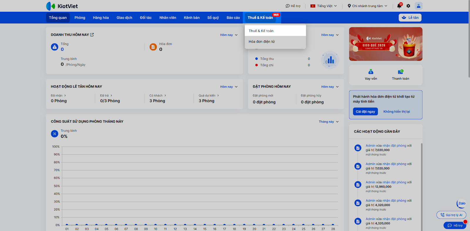 (1) Trên màn hình Quản lý, bạn truy cập vào menu Thuế & Kế toán → chọn Thuế & Kế toán.