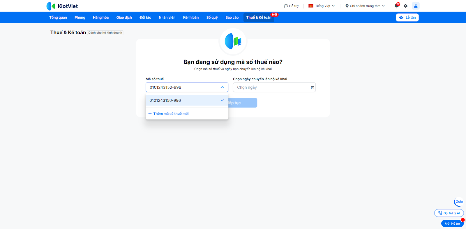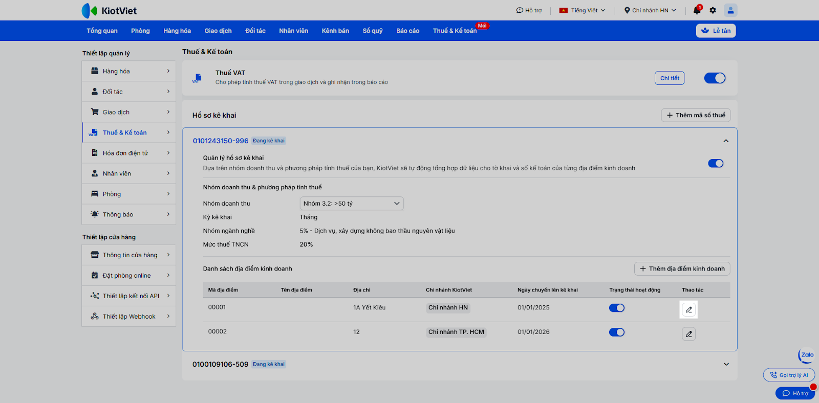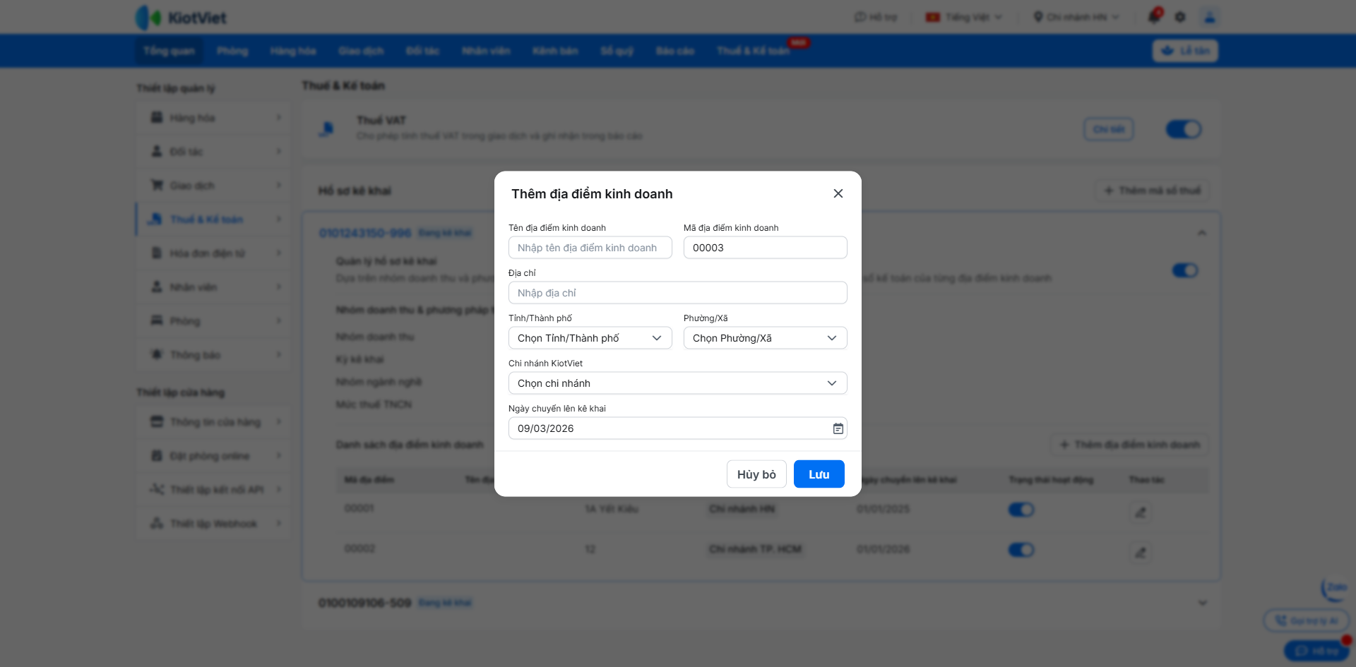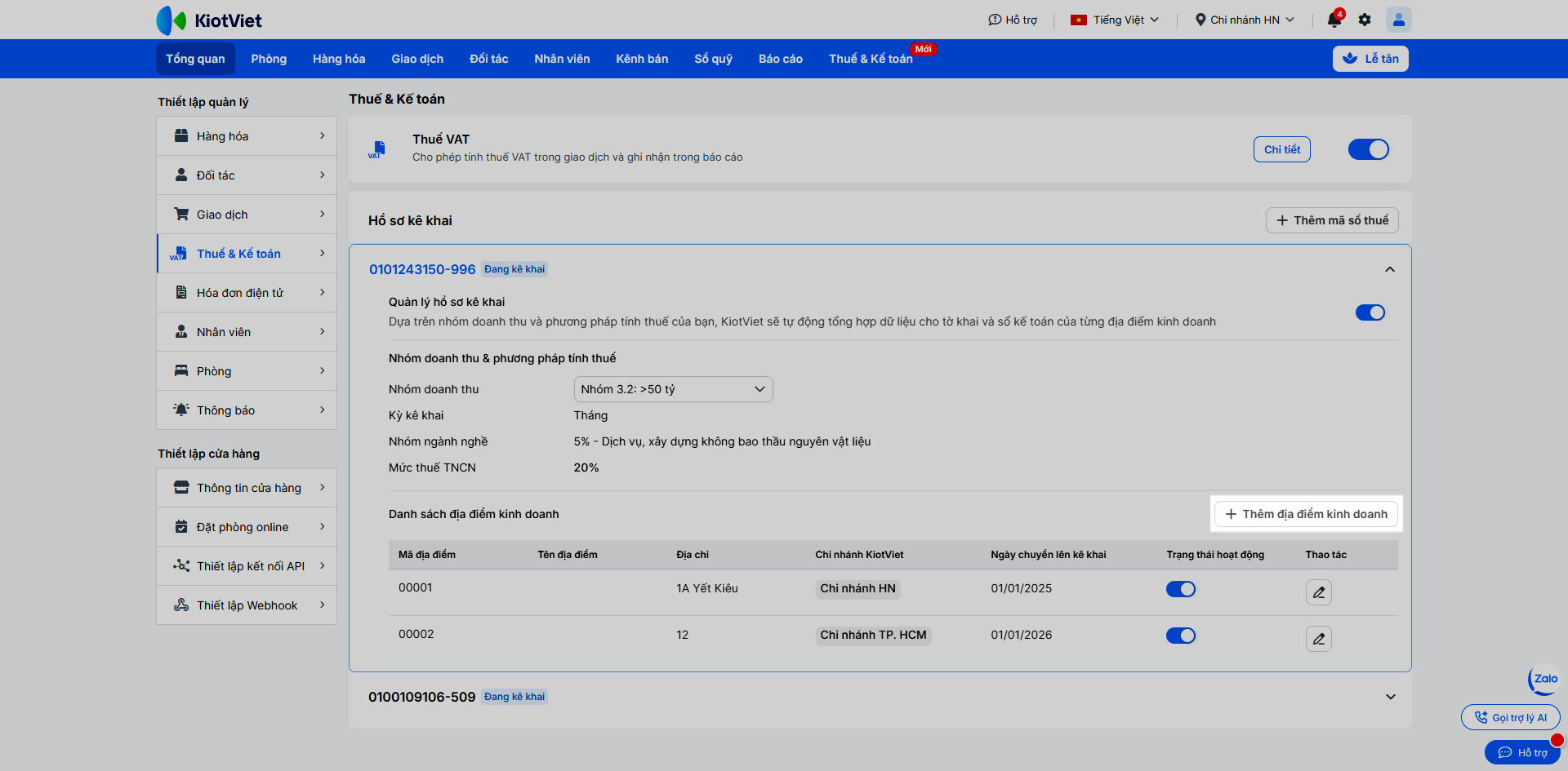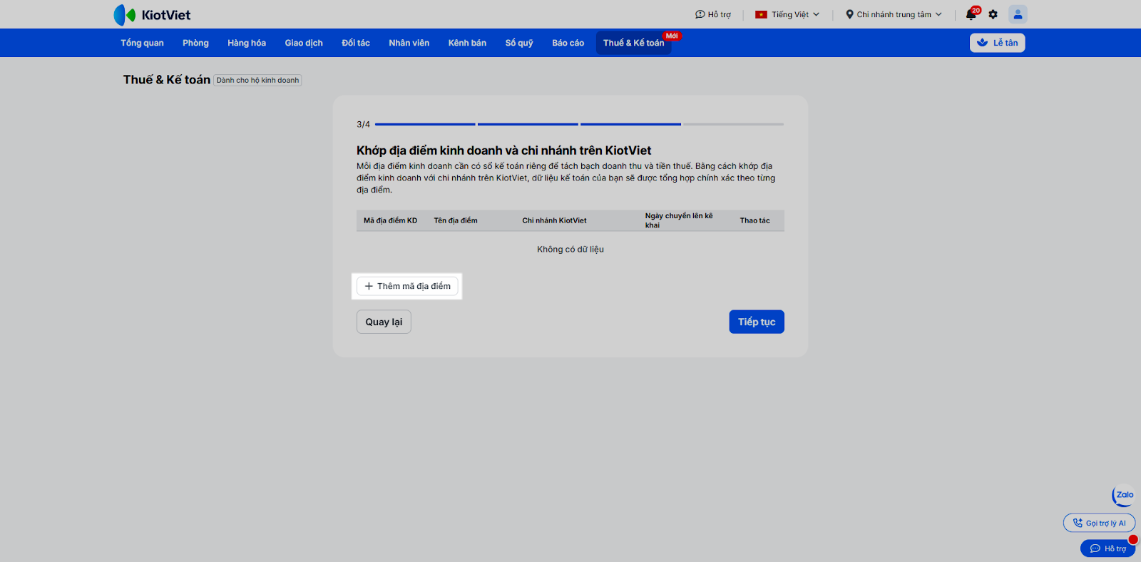 - Bước 3: Khớp địa điểm kinh doanh và chi nhánh trên KiotViet: Mỗi địa điểm kinh doanh cần có sổ kế toán riêng để tách bạch doanh thu và tiền thuế. Bằng cách khớp địa điểm kinh doanh với chi nhánh trên KiotViet, dữ liệu kế toán của bạn sẽ được tổng hợp chính xác theo từng địa điểm.