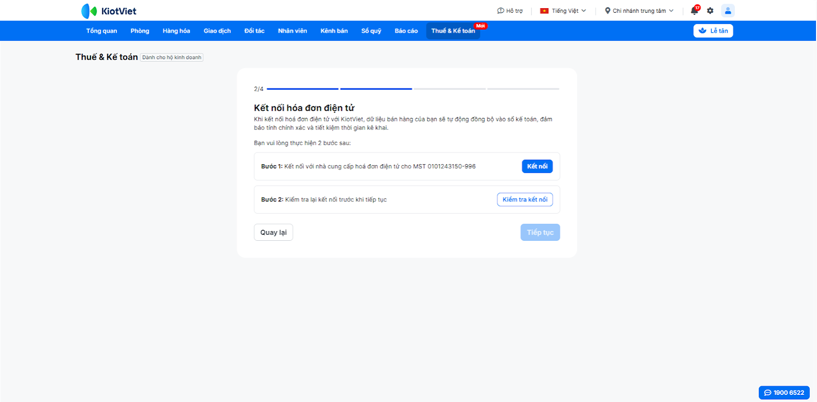 - Bước 2: Kết nối Hóa đơn điện tử (HĐĐT): Nếu nhóm doanh thu > 1 tỷ và chưa kết nối, bạn cần thực hiện kết nối HĐĐT. (Bước này được bỏ qua nếu doanh thu < 1 tỷ hoặc đã kết nối HĐĐT).