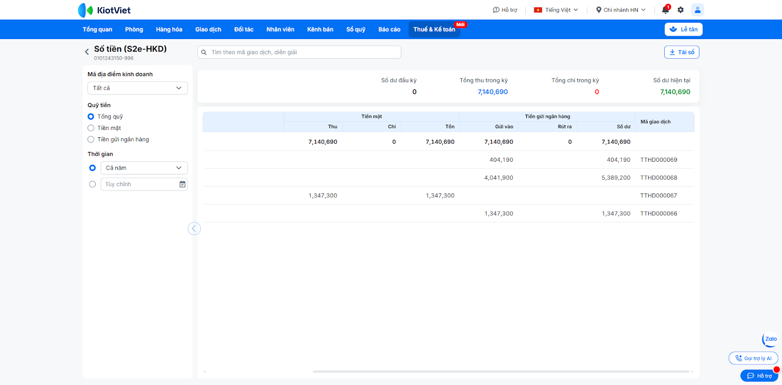 - Tiền gửi ngân hàng: Lọc thu chi qua chuyển khoản, thẻ, ví điện tử (Có thêm bộ lọc theo Tài khoản).