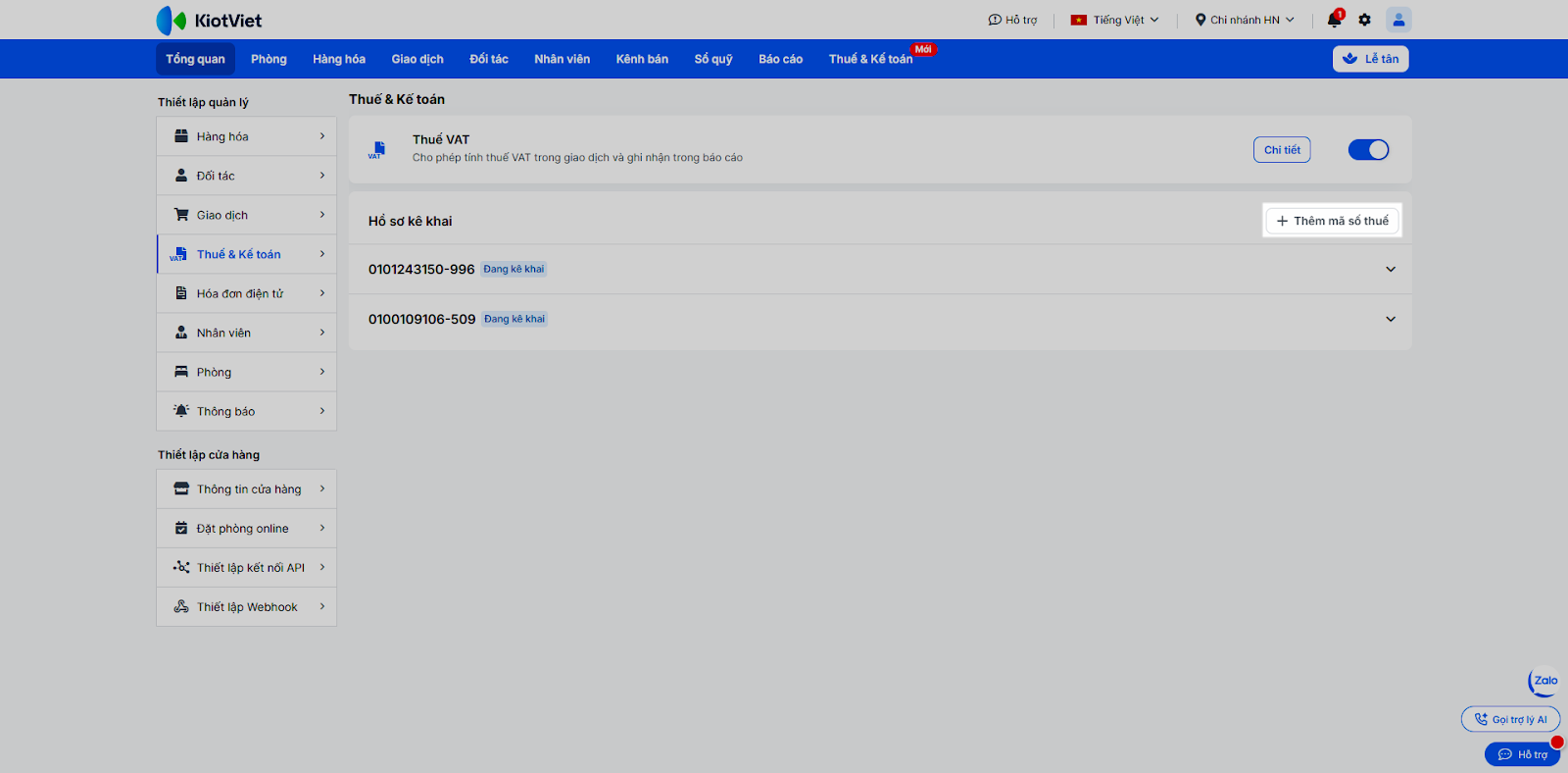 - Thêm mã số thuế: Nhập thông tin MST mới để quản lý thông tin.