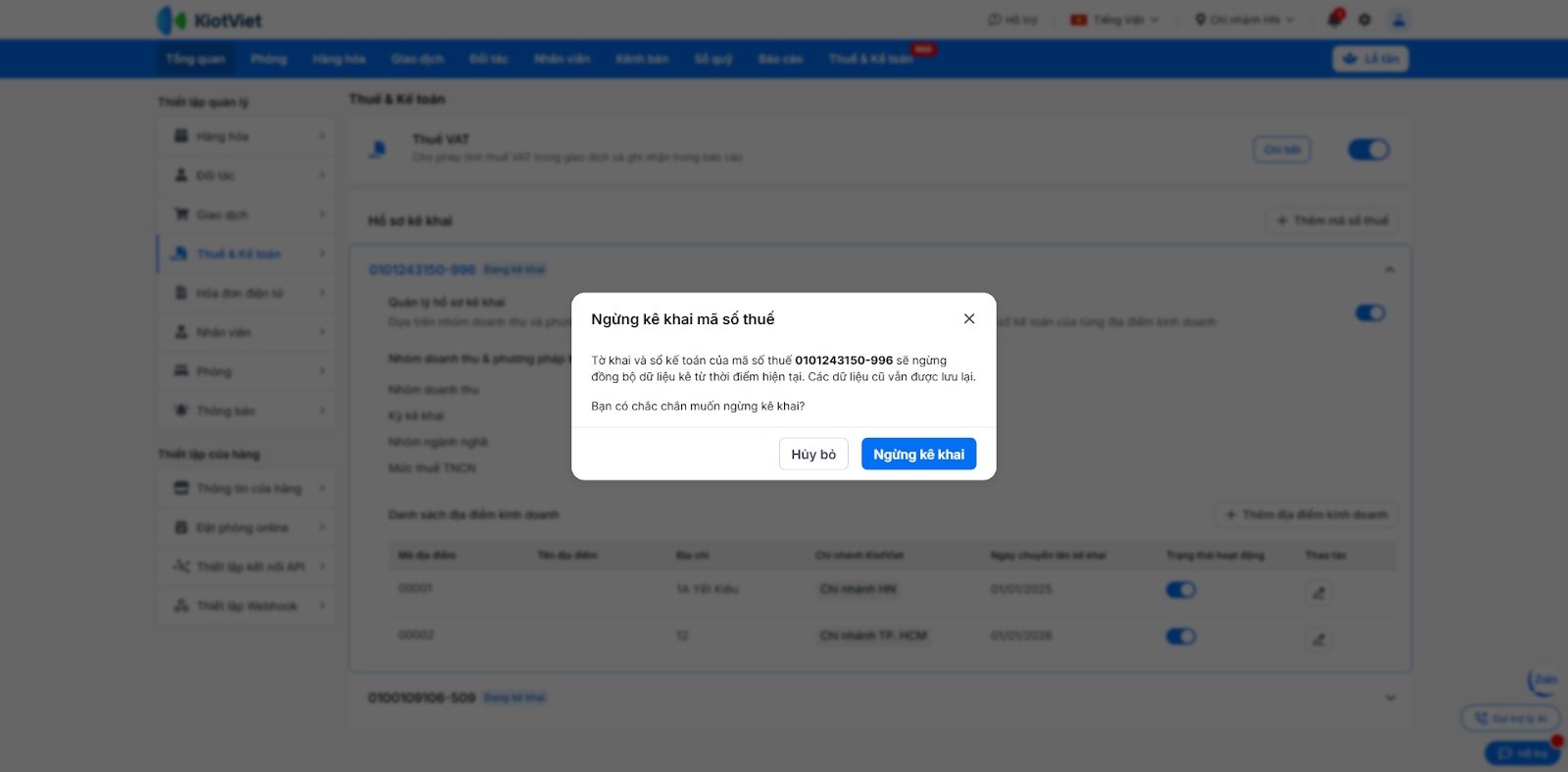 - Ngừng hoạt động địa điểm kinh doanh: Trên dòng địa điểm kinh doanh cụ thể → tắt xám → xác nhận Ngừng hoạt động để ngừng đồng bộ dữ liệu vào địa điểm này.