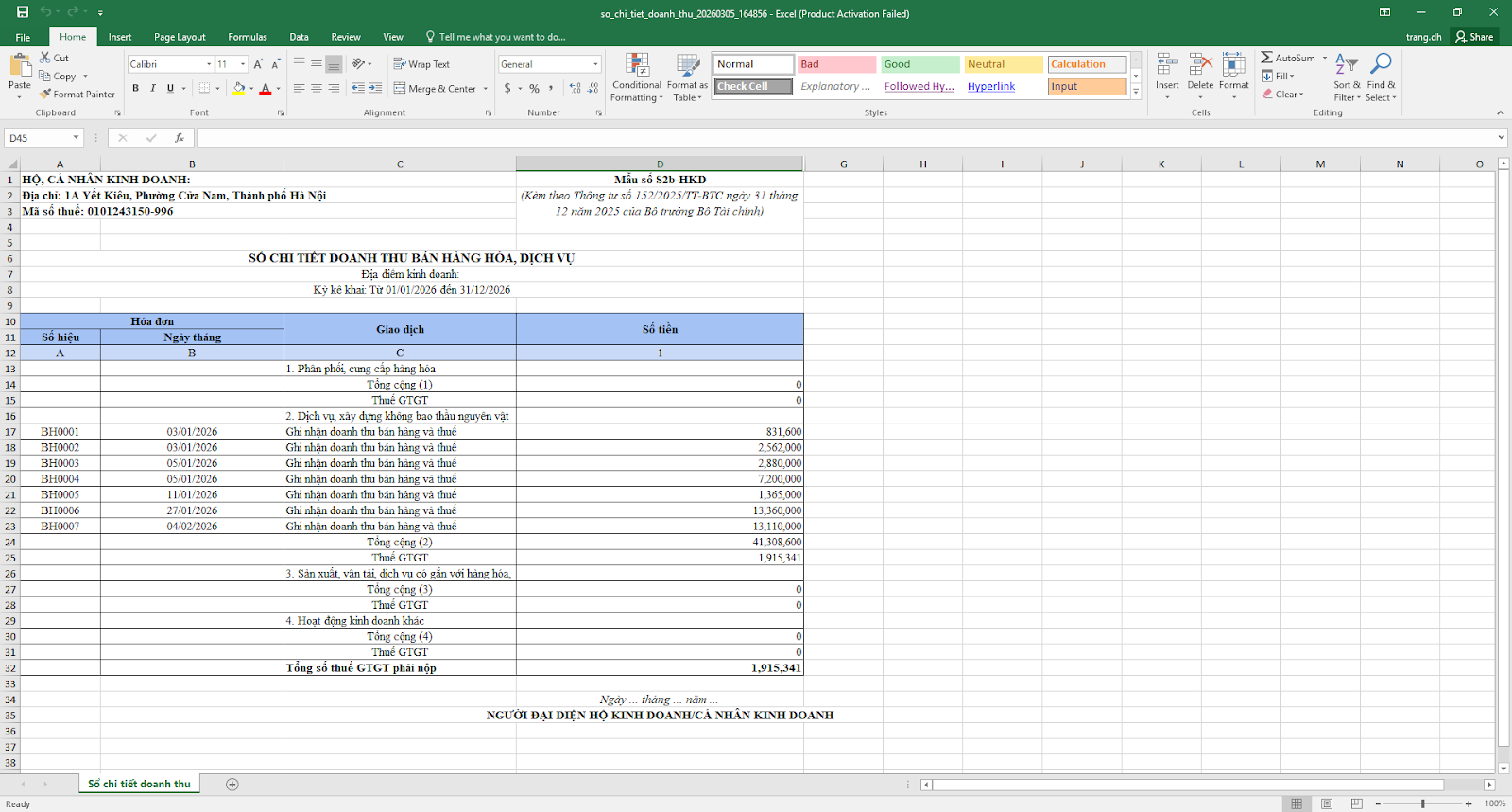 (3) Sổ doanh thu bán hàng hóa, dịch vụ (Mẫu S2b-HKD): Phân loại doanh thu để tính thuế GTGT chính xác (Nhóm doanh thu trên 500 triệu theo lợi nhuận).