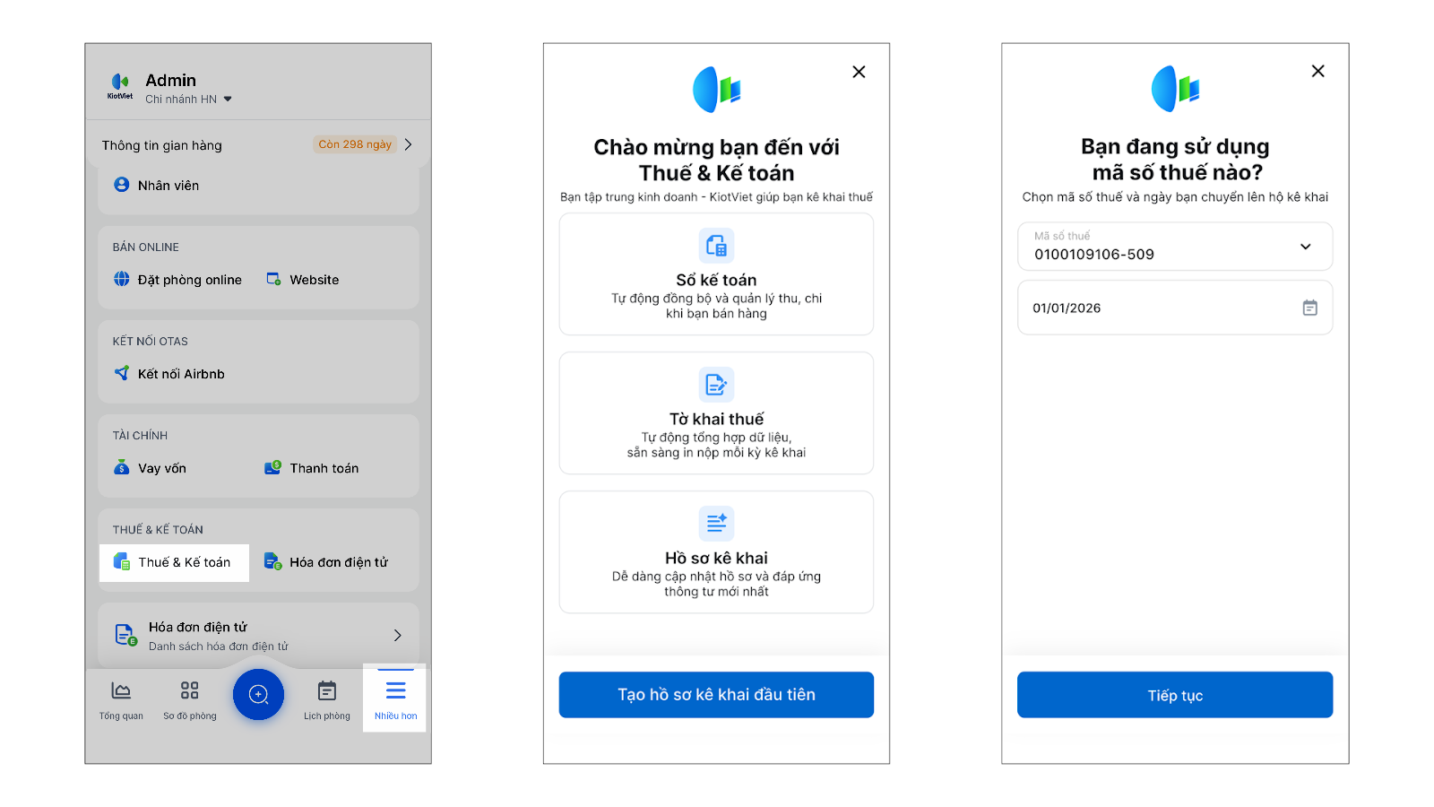 - Trên menu Nhiều hơn → bạn chọn Thuế & Kế toán → chạm Tạo hồ sơ kê khai đầu tiên → Chọn Mã số thuế và Ngày chuyển lên hộ kê khai → chạm Tiếp tục.