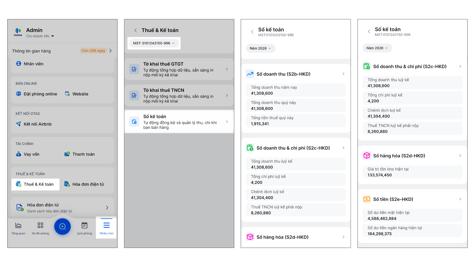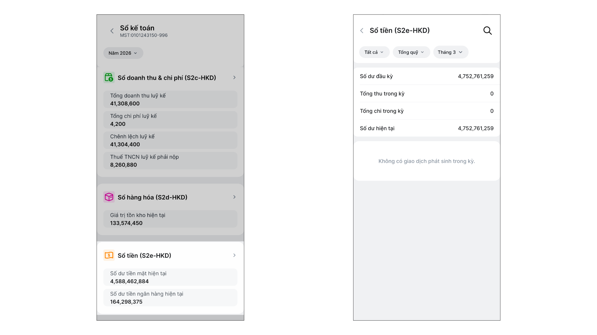 Ứng dụng cho phép xem tổng quan và truy cập chi tiết đầy đủ các loại sổ kế toán (S1a, S2a, S2b, S2c, S2d, S2e) tương tự như trên nền tảng Web. Số liệu được đồng bộ theo thời gian thực, giúp bạn nắm bắt tình hình tài chính mọi lúc mọi nơi.