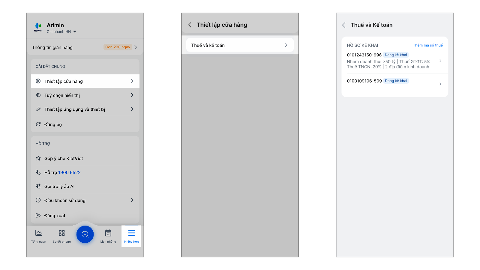 Tính năng Thuế và Kế toán trong menu Nhiều hơn → Thiết lập cửa hàng hỗ trợ người dùng thêm mới, chỉnh sửa và quản lý danh sách Mã số thuế (MST) hoặc bật/tắt trạng thái hoạt động của các địa điểm kinh doanh trực tiếp trên ứng dụng, đảm bảo tính linh hoạt trong quản lý hệ thống chuỗi tương tự như trên Web.