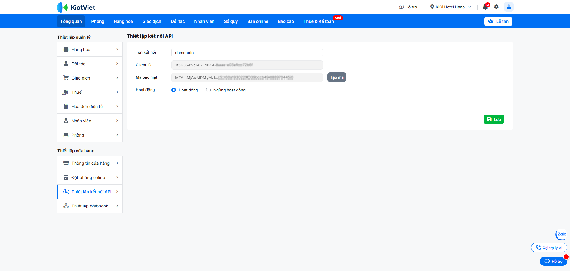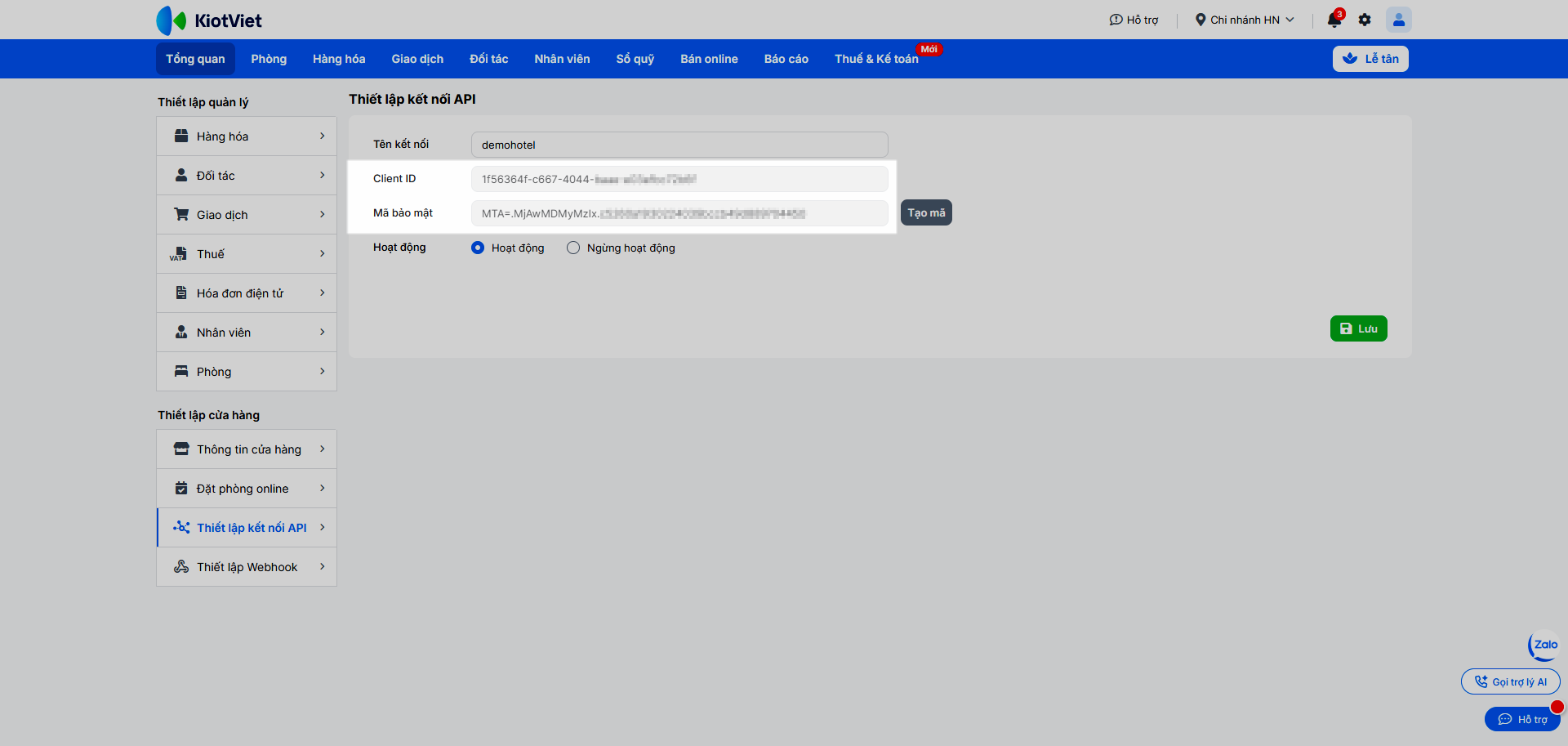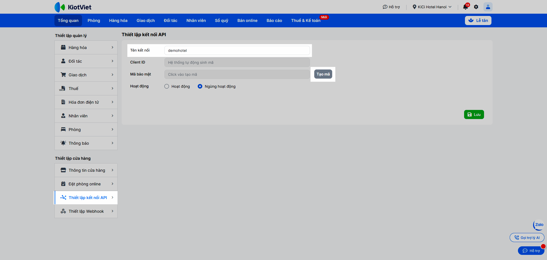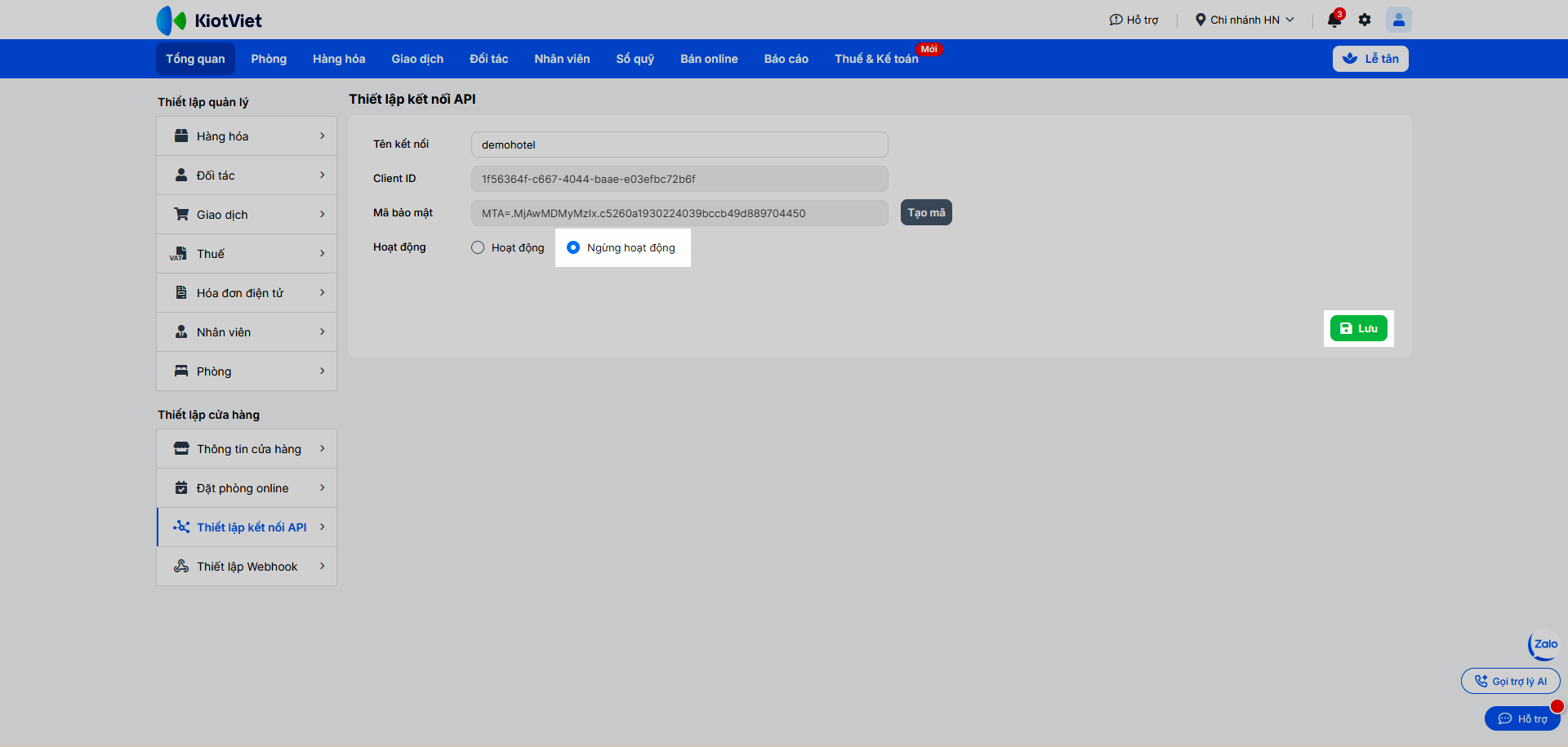 – Để ngừng hoạt động kết nối API, bạn chọn Ngừng hoạt động → nhấn Lưu để hoàn tất.