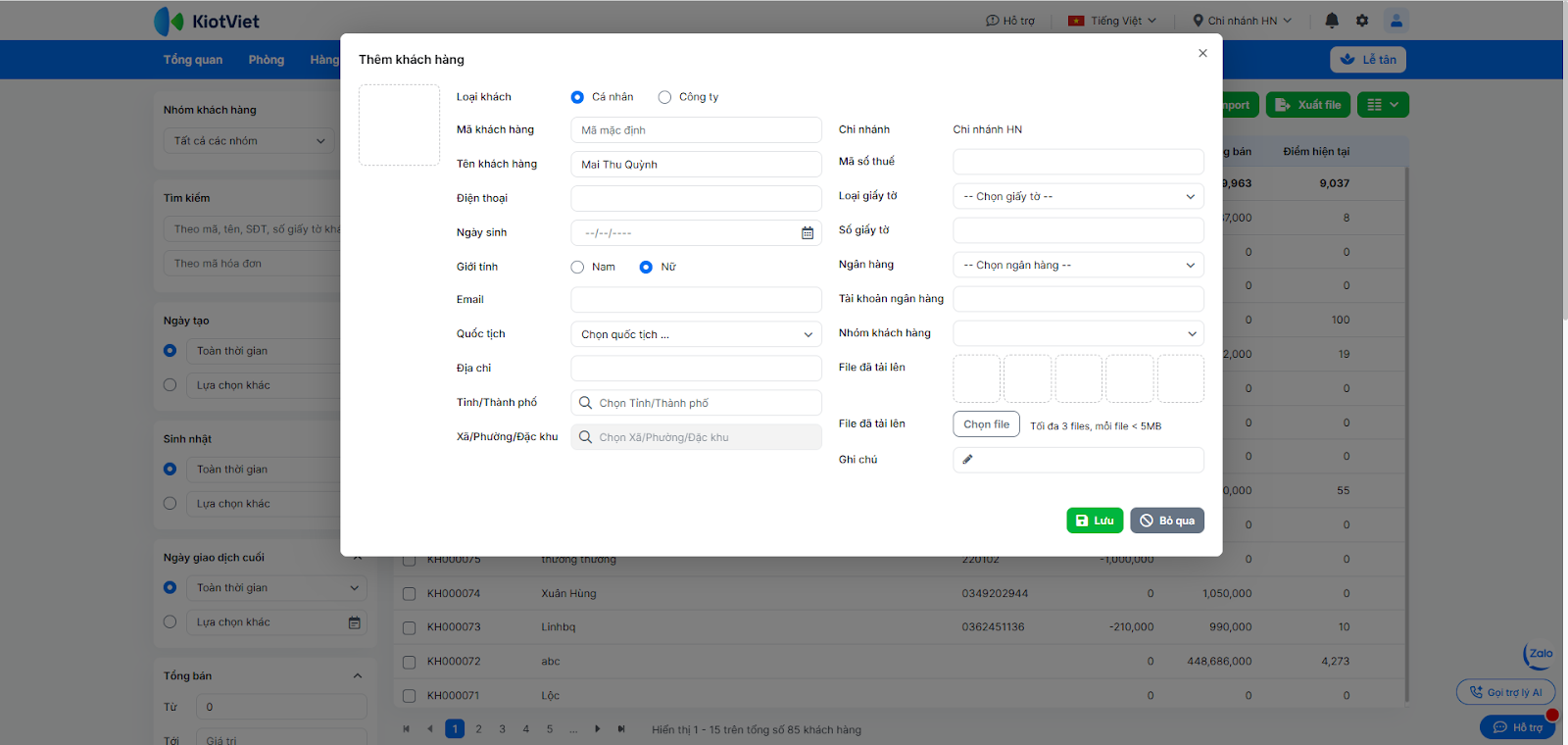 1. Thêm mới khách hàng