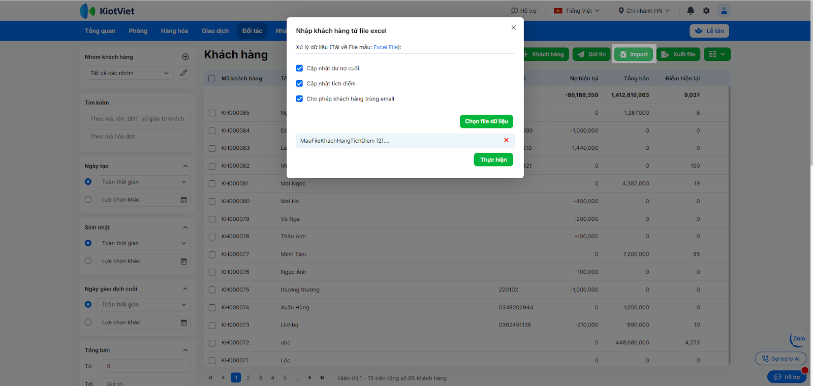 - Danh sách khách hàng sẽ hiển thị.