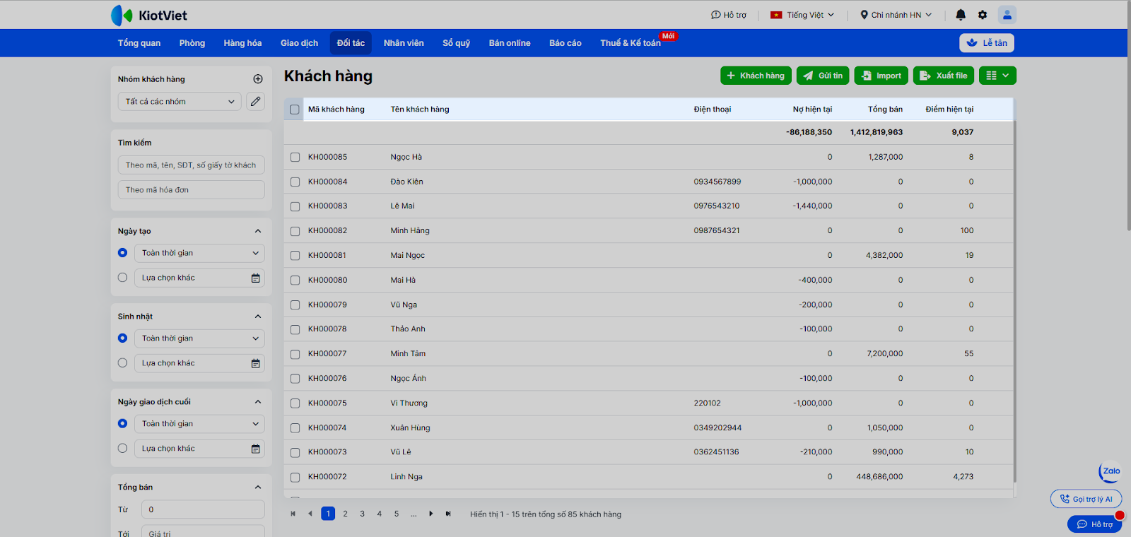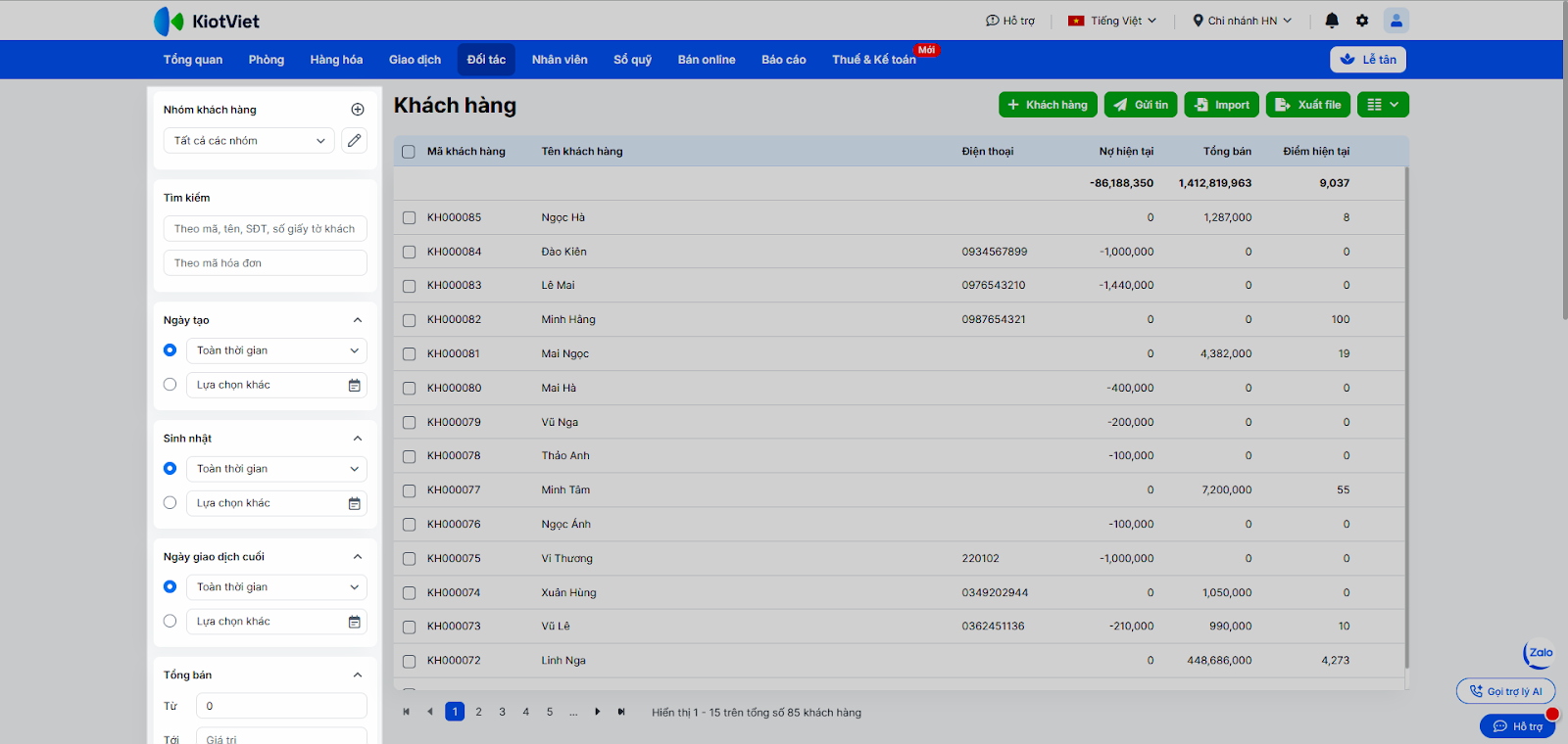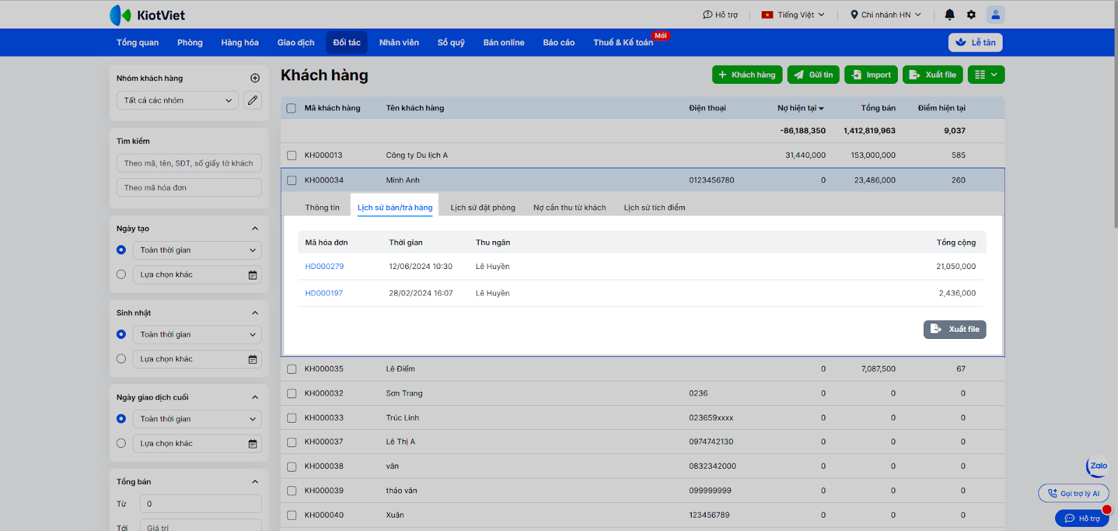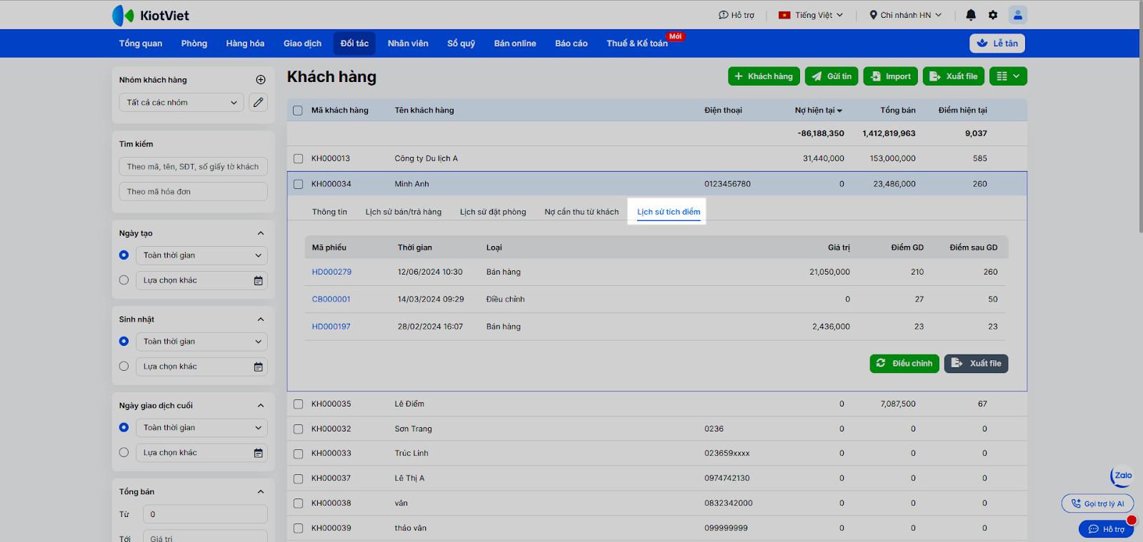- Tại ô tìm kiếm, nhập mã, tên, số điện thoại hoặc số giấy tờ khách. Bạn cũng có thể dùng bộ lọc để tìm theo Nhóm khách hàng, Ngày tạo, Sinh nhật, Ngày giao dịch cuối, Tổng bán, Nợ hiện tại, Điểm hiện tại, Loại khách, Giới tính, Khu vực, Trạng thái.