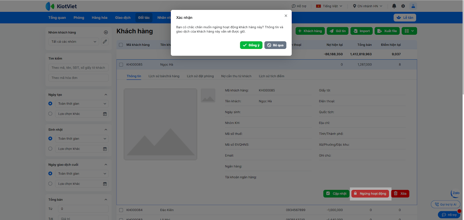 - Nếu muốn khách hàng này không hiển thị khi tìm kiếm trên màn hình Lễ tân nhưng lịch sử giao dịch cũ vẫn được giữ nguyên → bạn nhấn Ngừng hoạt động → nhấn Đồng ý để xác nhận thông tin.