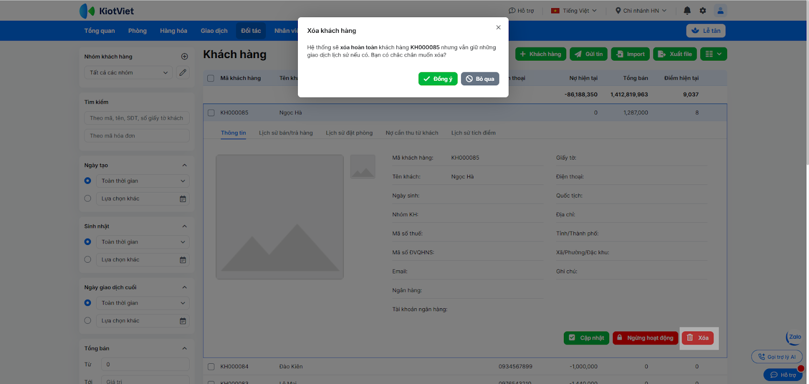 - Nếu muốn xóa khách hàng khỏi hệ thống → bạn nhấn Xóa → nhấn Đồng ý để xác nhận thông tin. Hệ thống sẽ xóa hoàn toàn khách hàng này nhưng vẫn giữ thông tin trong các giao dịch lịch sử nếu có. Khi xem lại, khách hàng đã xóa sẽ có thêm hậu tố {DEL}.