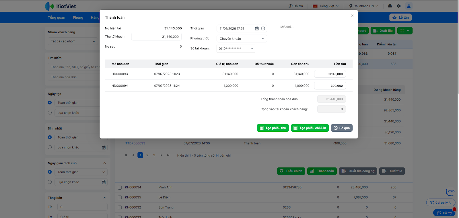 - Nhấn Tạo phiếu thu để ghi nhận và trừ nợ cho khách hàng.