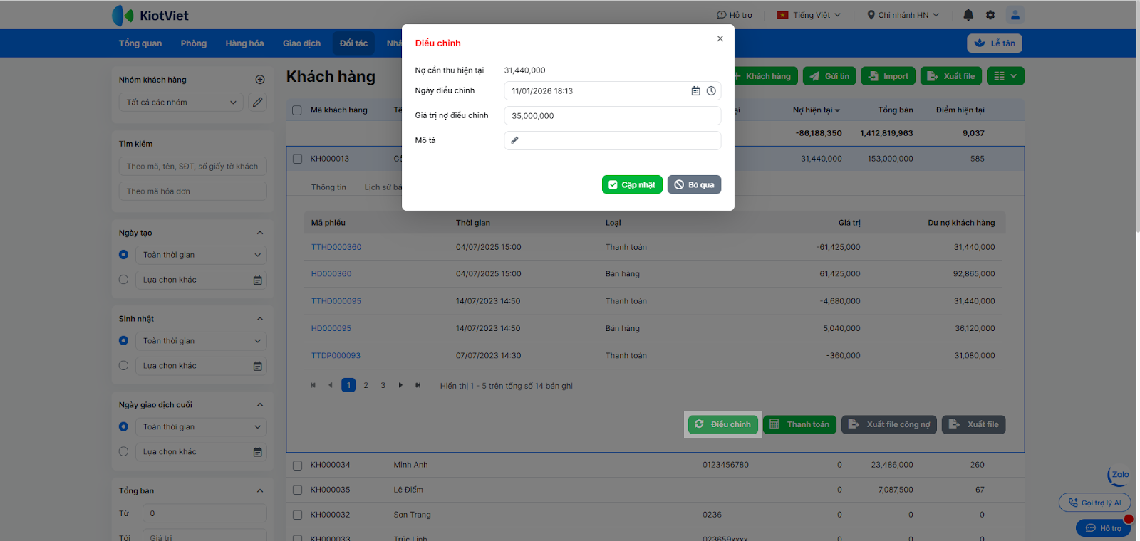 3. Quản lý lịch sử giao dịch, công nợ