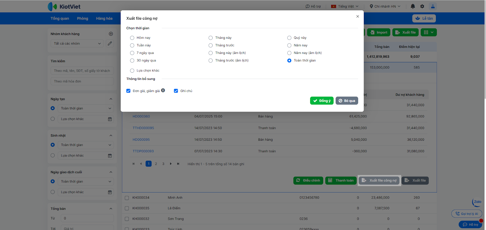 - Bạn nhấn Xuất file công nợ → Chọn thời gian cần xuất dữ liệu → tích chọn các Thông tin bổ sung (Đơn giá, giảm giá; Ghi chú)→ nhấn Thực hiện.