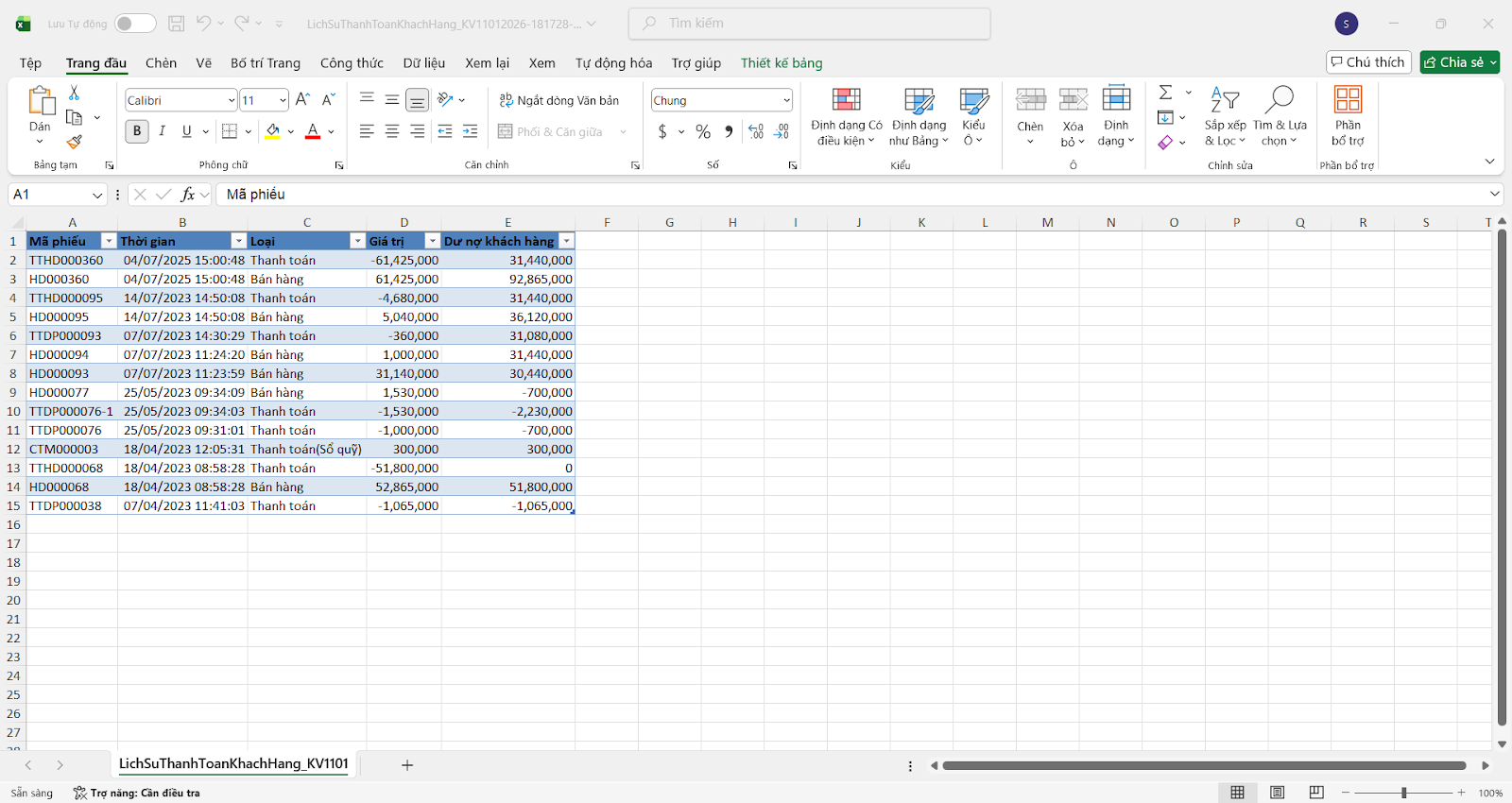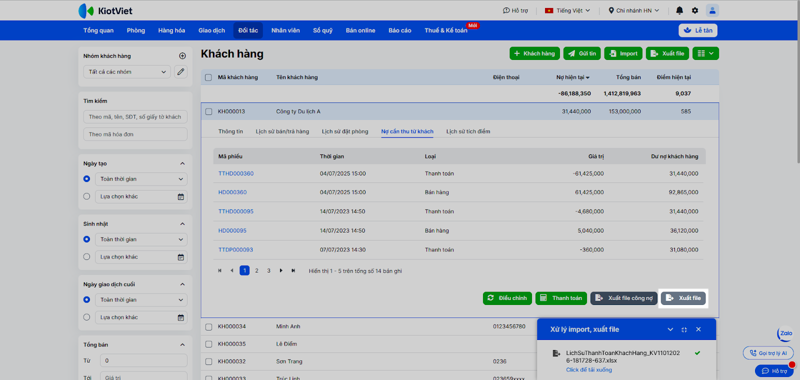 - Hệ thống xuất file Công nợ chi tiết khách hàng với định dạng excel.