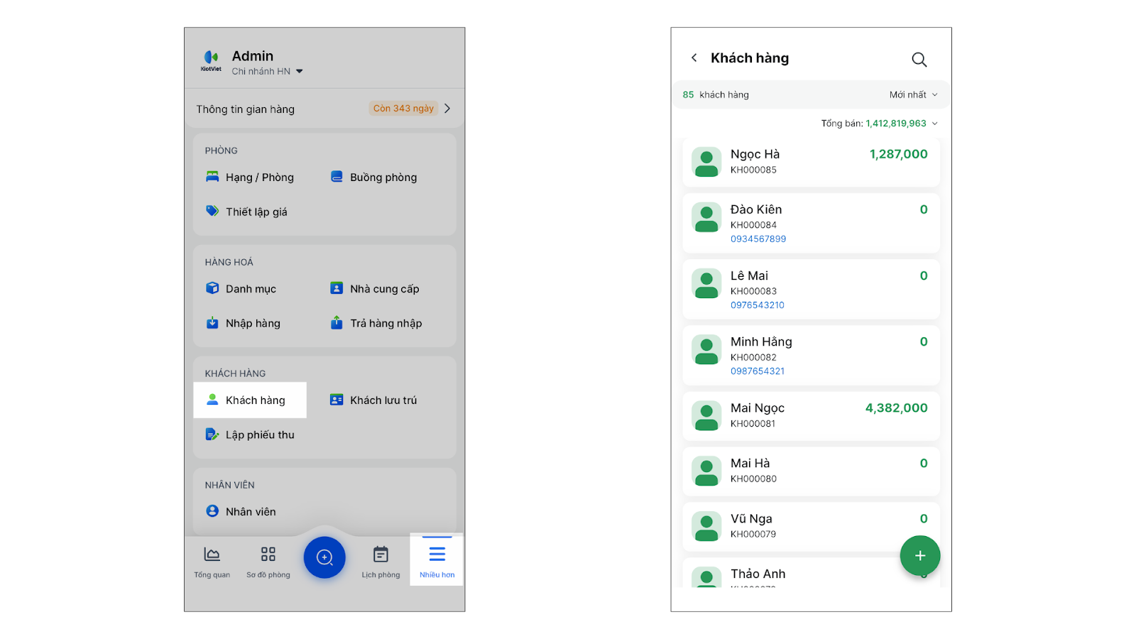 - Thao tác thực hiện như sau: Mở ứng dụng KiotViet Hotel, vào menu Nhiều hơn → chọn Khách hàng.