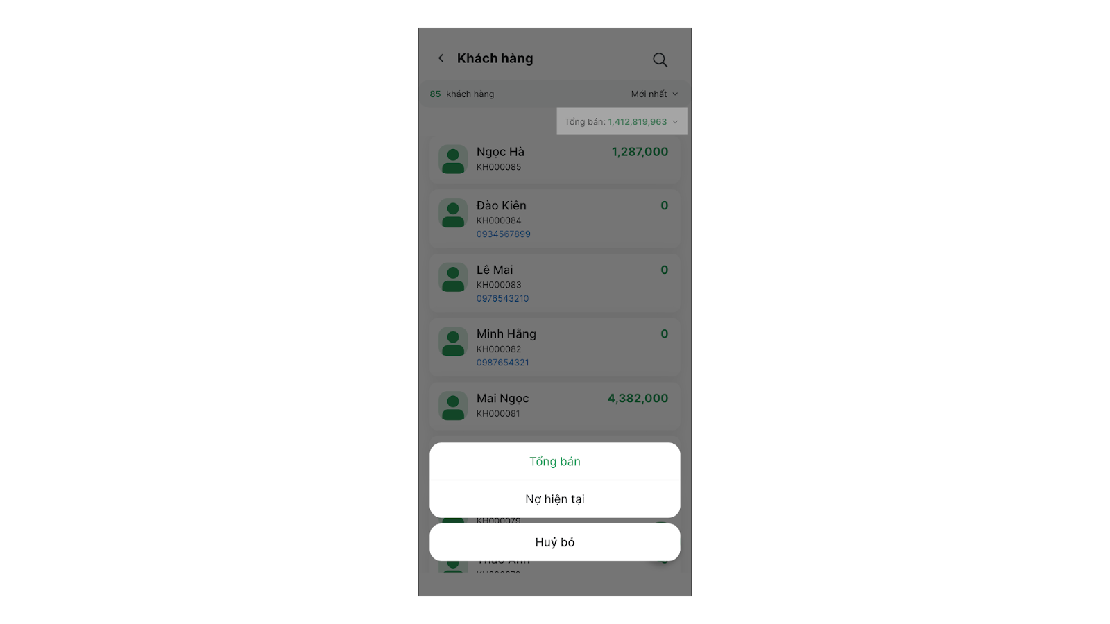 - Để sắp xếp, nhấn vào tiêu đề cột VD: Tổng bán, Nợ hiện tại để hệ thống hiển thị danh sách theo thứ tự giảm dần, giúp bạn dễ dàng nhận diện khách VIP hoặc khách nợ nhiều.