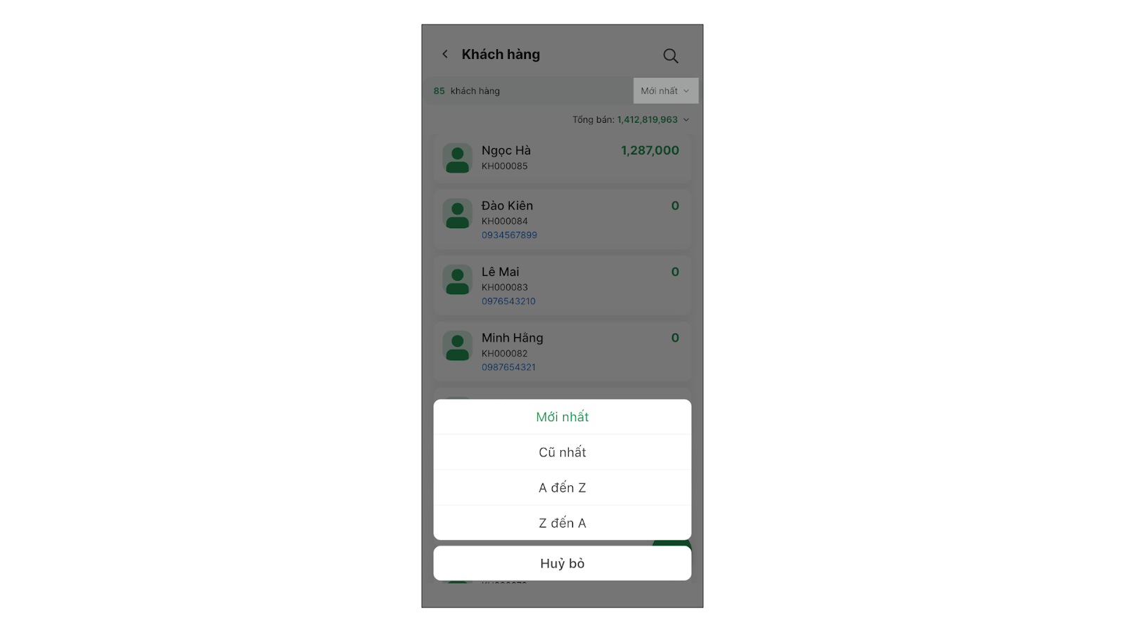 - Để sắp xếp thứ tự hiển thị khách hàng, bạn chọn Mới nhất.