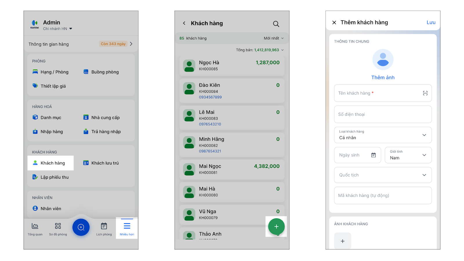 - Nhấn + Khách hàng → nhập thông tin → nhấn Lưu.