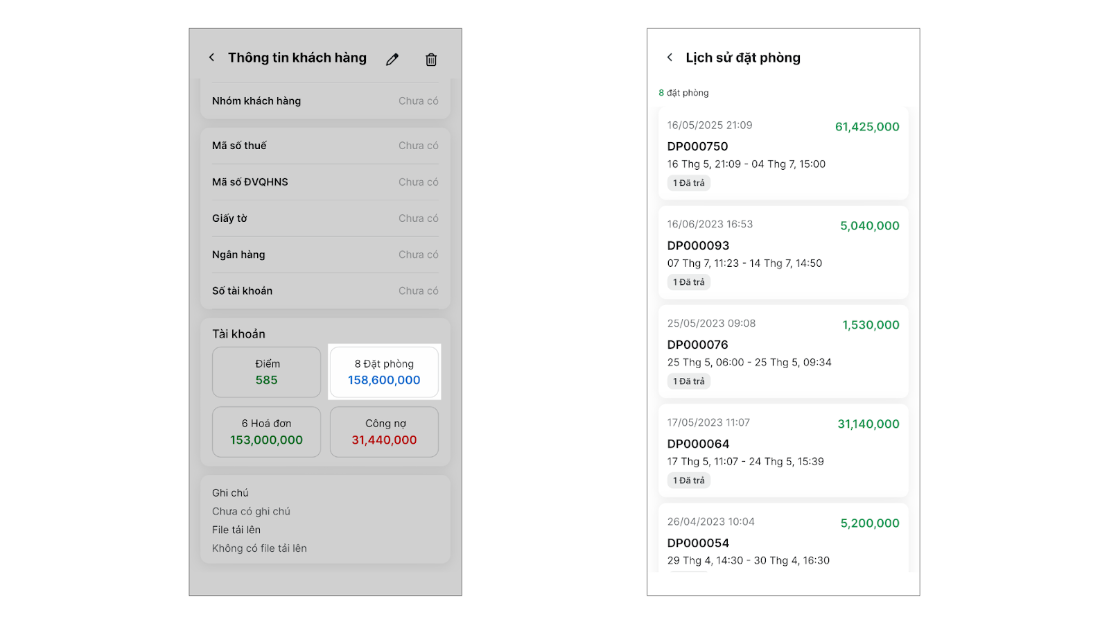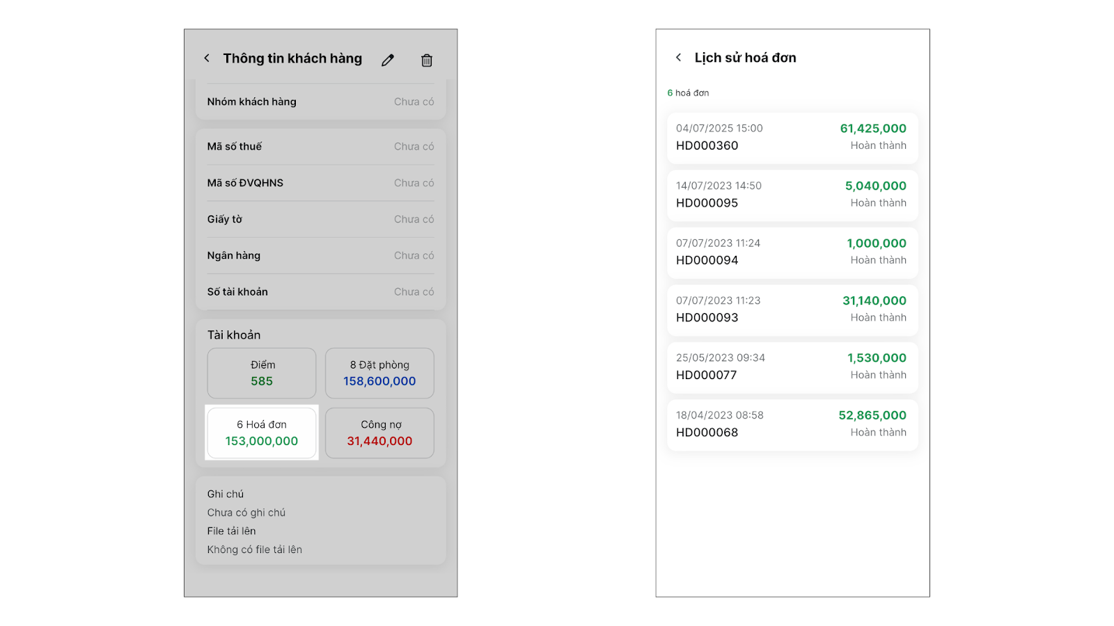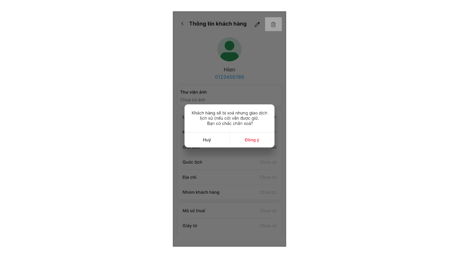 - Xóa khách hàng: Mở chi tiết khách hàng, chạm vào biểu tượng thùng rác → chọn Đồng ý.