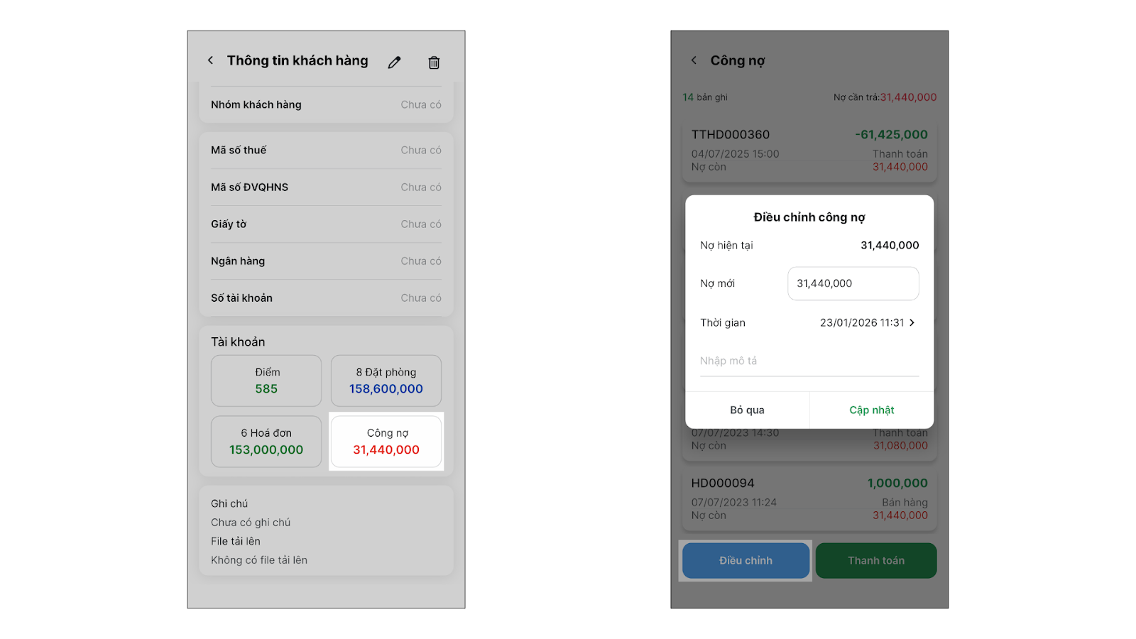 - Tình huống: Bạn cần xem lại giao dịch, thu nợ hoặc điều chỉnh nợ cho khách ngay trên điện thoại.