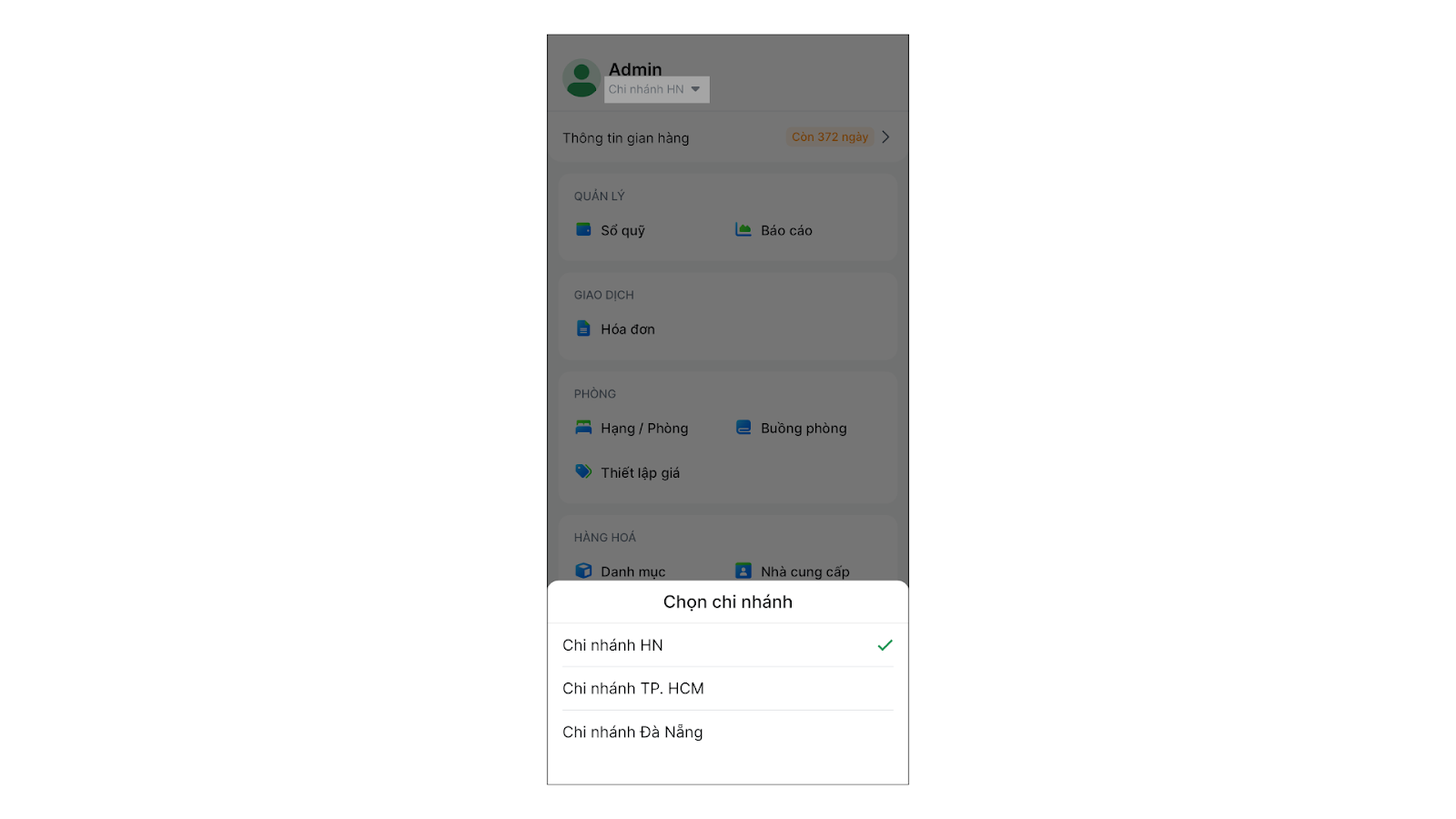 - Danh sách các chi nhánh bạn được phân quyền sẽ hiện ra → chạm chọn chi nhánh cần chuyển đến. Hệ thống sẽ tự động tải lại dữ liệu của chi nhánh mới.