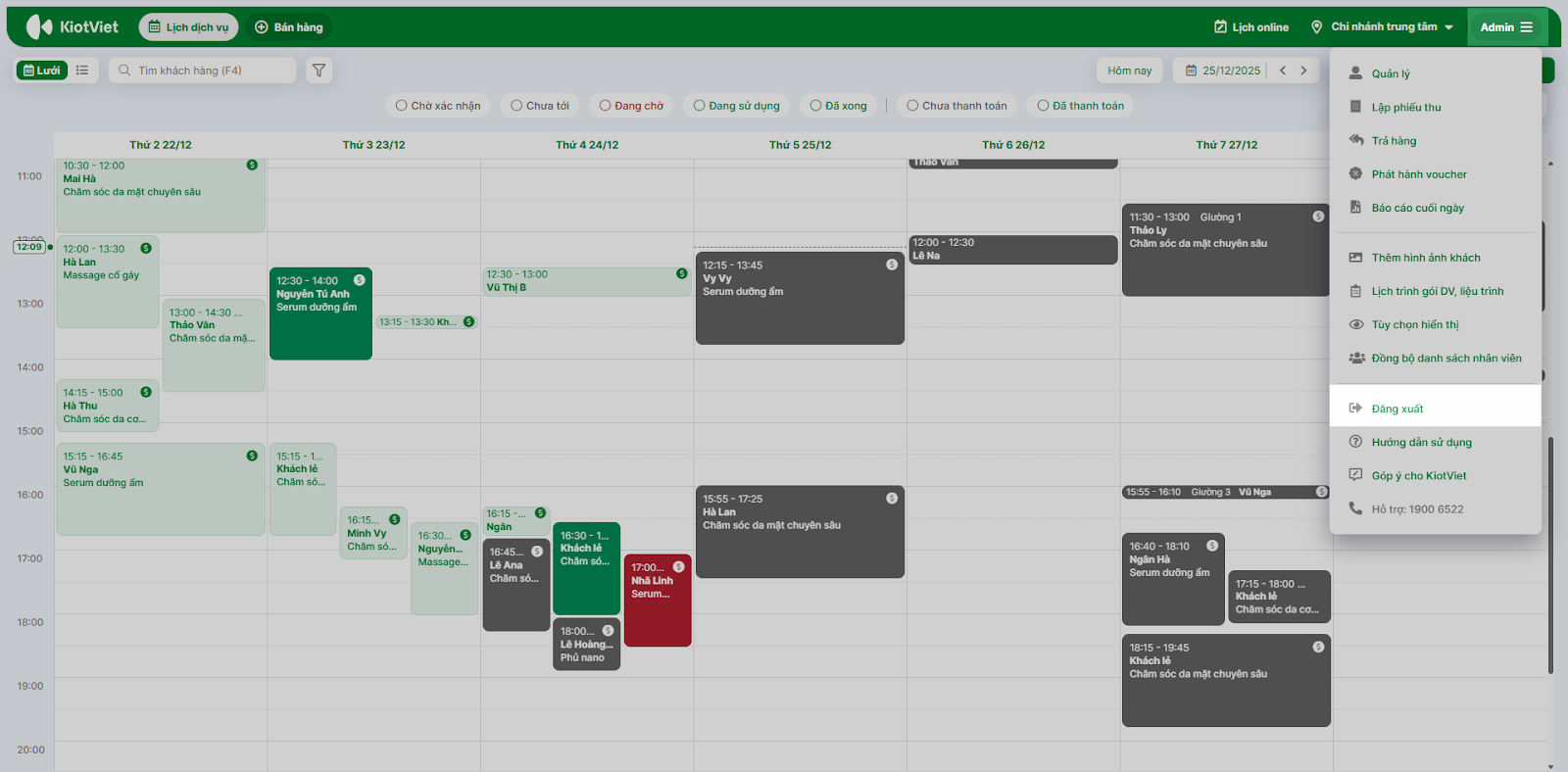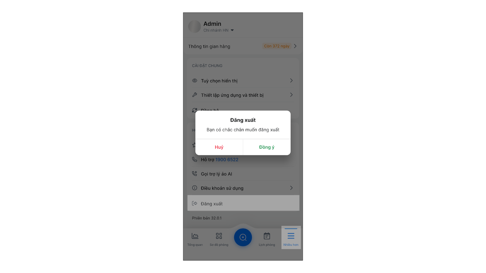 - Cách 2: Tại màn hình Lễ tân: Nhấn vào biểu tượng tùy chọn (3 gạch góc phải màn hình) → chọn Đăng xuất.