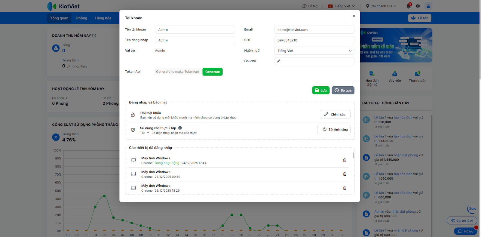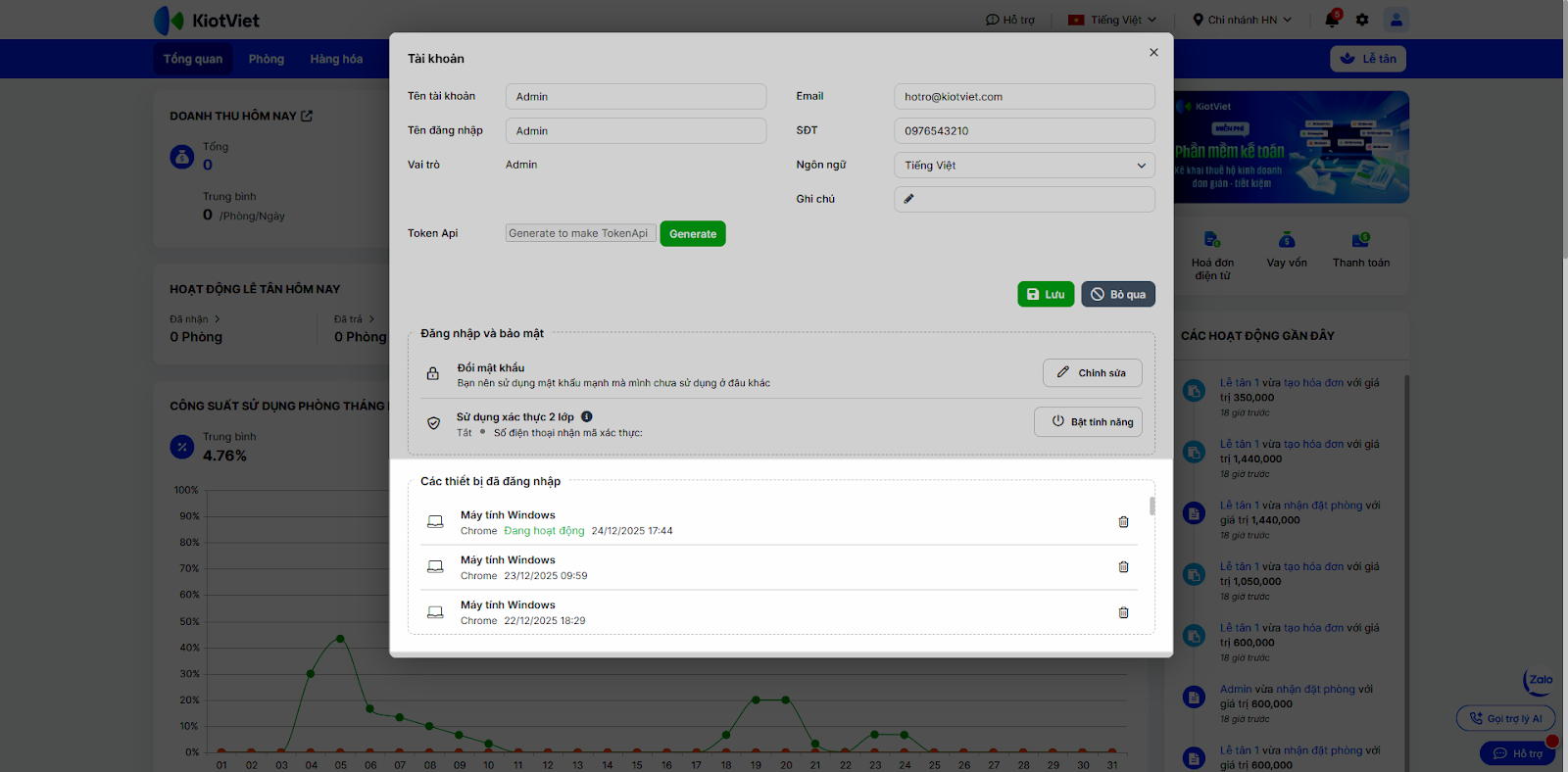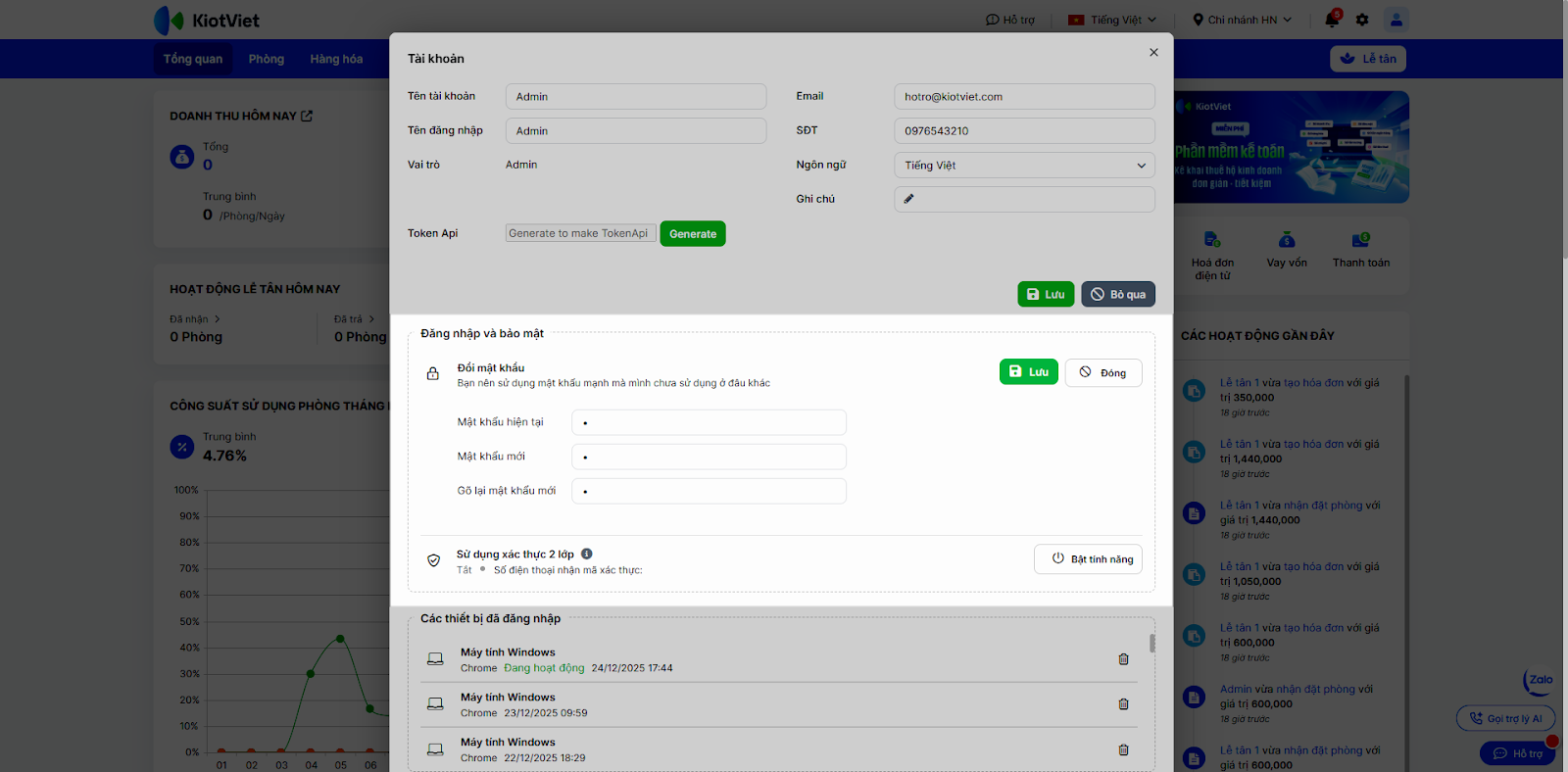 - Đối với tài khoản chủ gian hàng (Admin), bạn có thể xem thêm danh sách Các thiết bị đã đăng nhập để kiểm soát quyền truy cập.