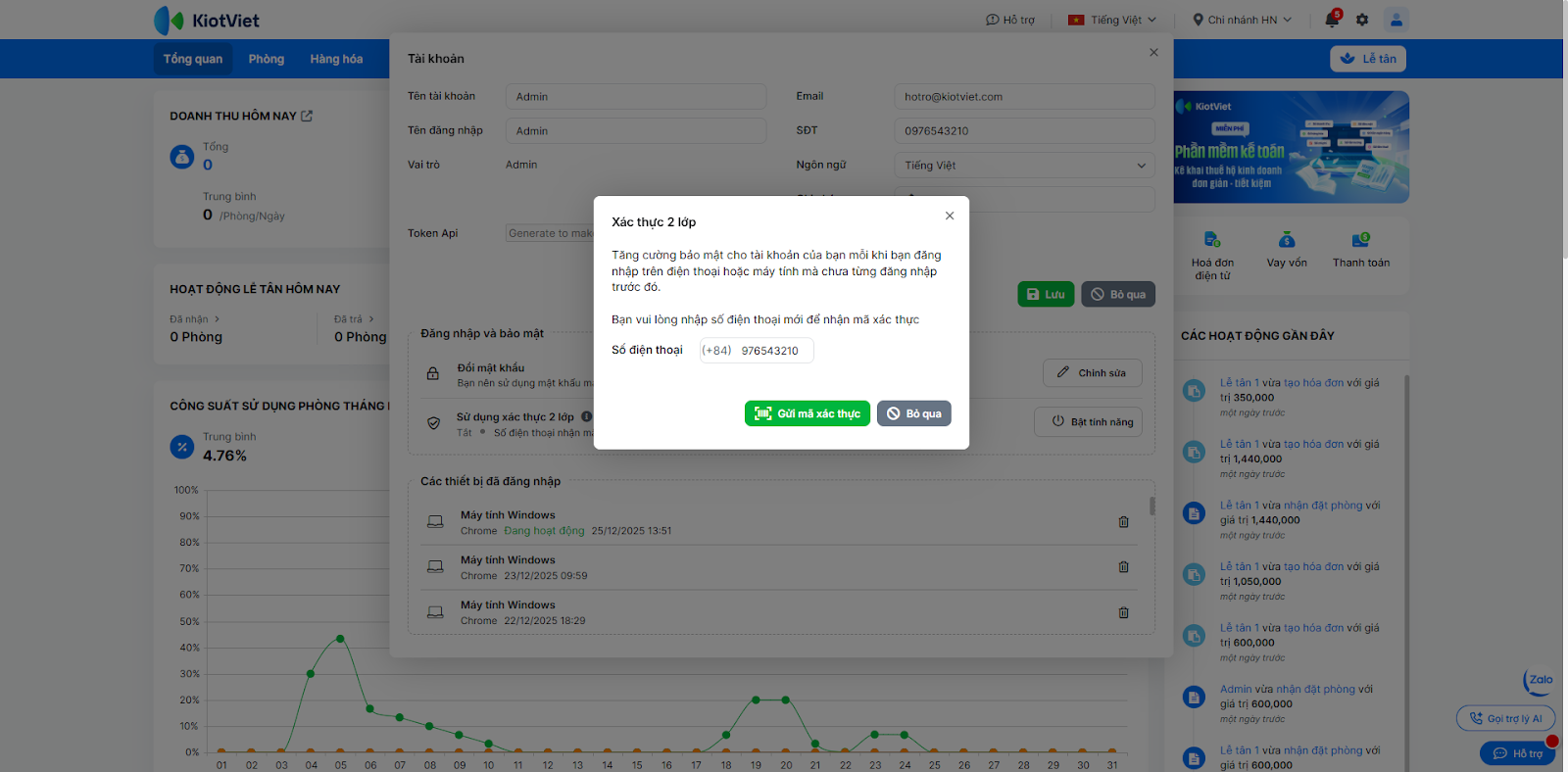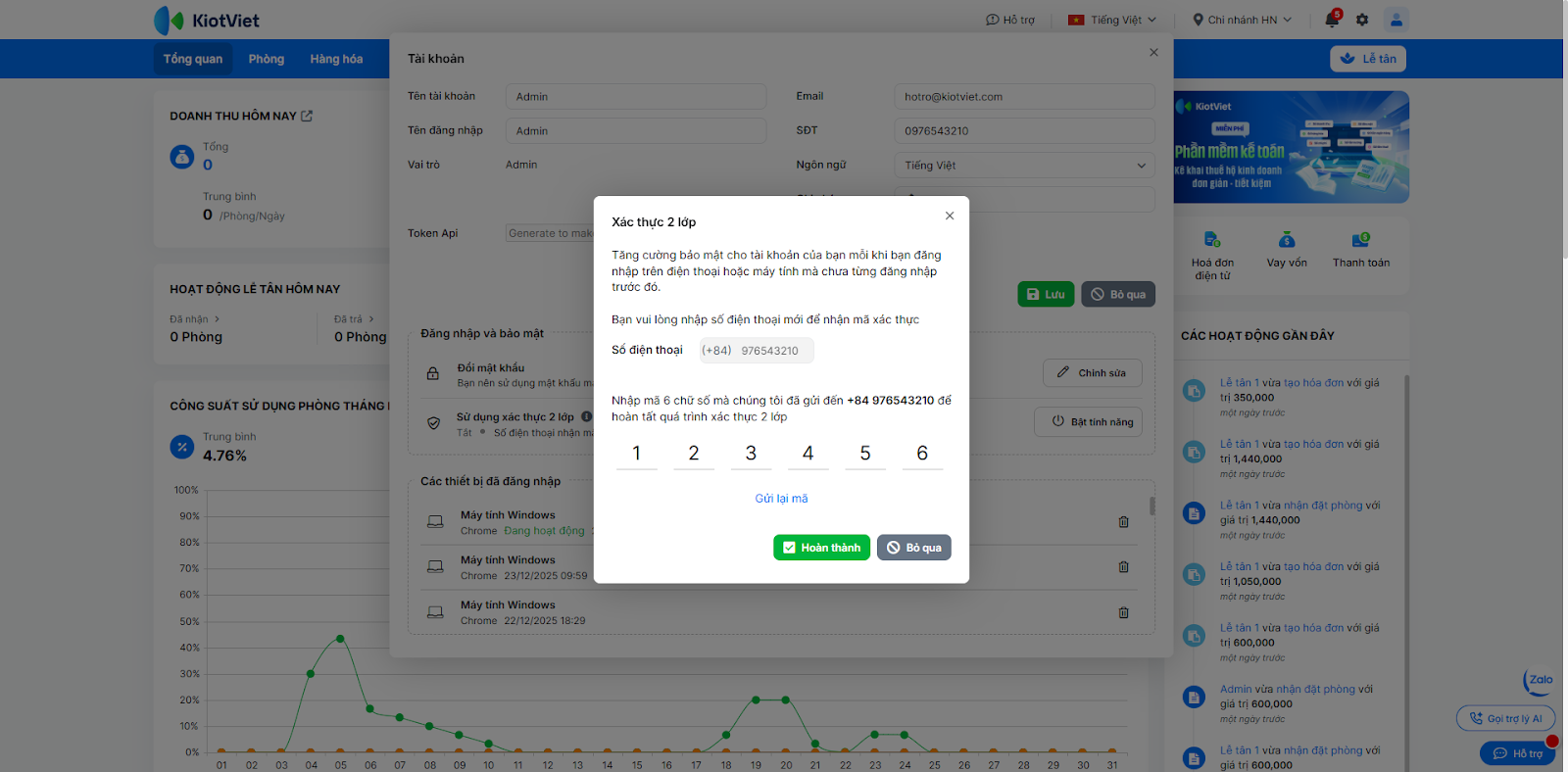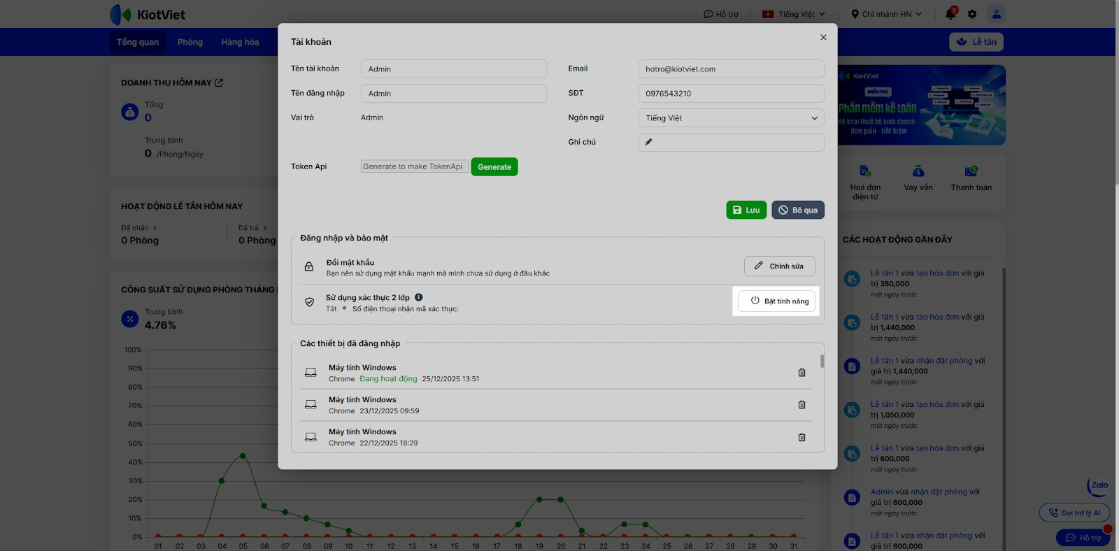 - Đối với tài khoản chủ gian hàng (Admin), bạn có thể xem thêm danh sách Các thiết bị đã đăng nhập để kiểm soát quyền truy cập.