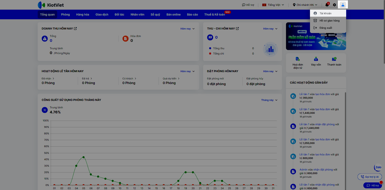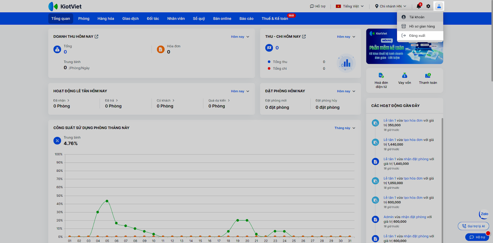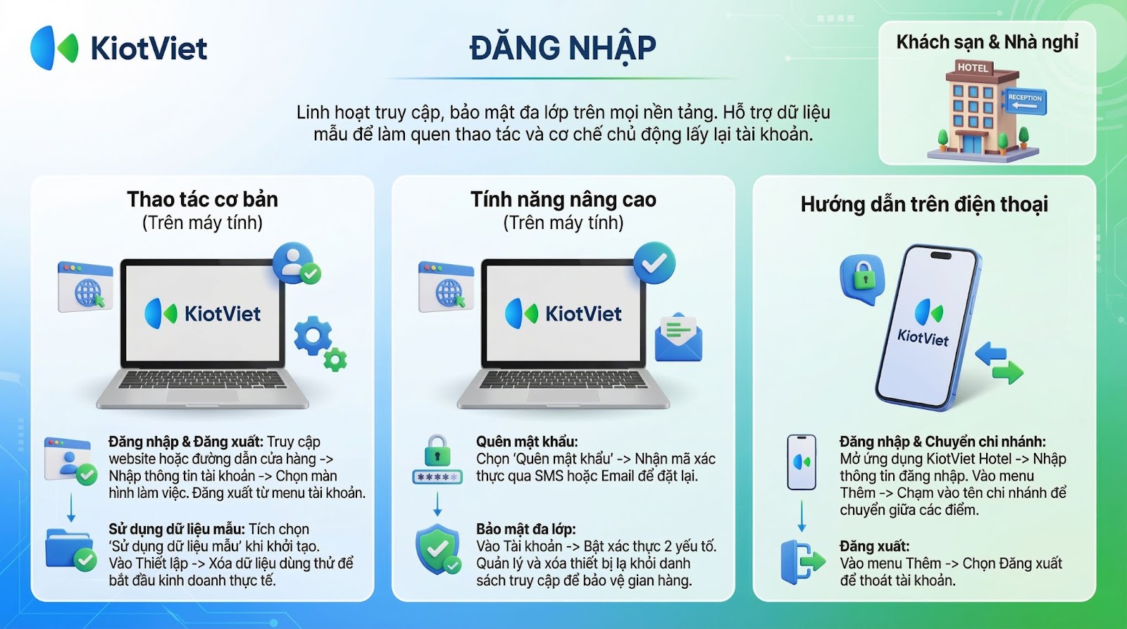 Hệ thống quản lý khách sạn KiotViet cung cấp quy trình đăng nhập linh hoạt và bảo mật, giúp bạn dễ dàng truy cập dữ liệu kinh doanh mọi lúc, mọi nơi. Ngoài việc quản lý truy cập, hệ thống còn hỗ trợ các tính năng bảo vệ tài khoản chuyên sâu và dữ liệu mẫu giúp người dùng mới làm quen với các nghiệp vụ lưu trú một cách nhanh chóng.