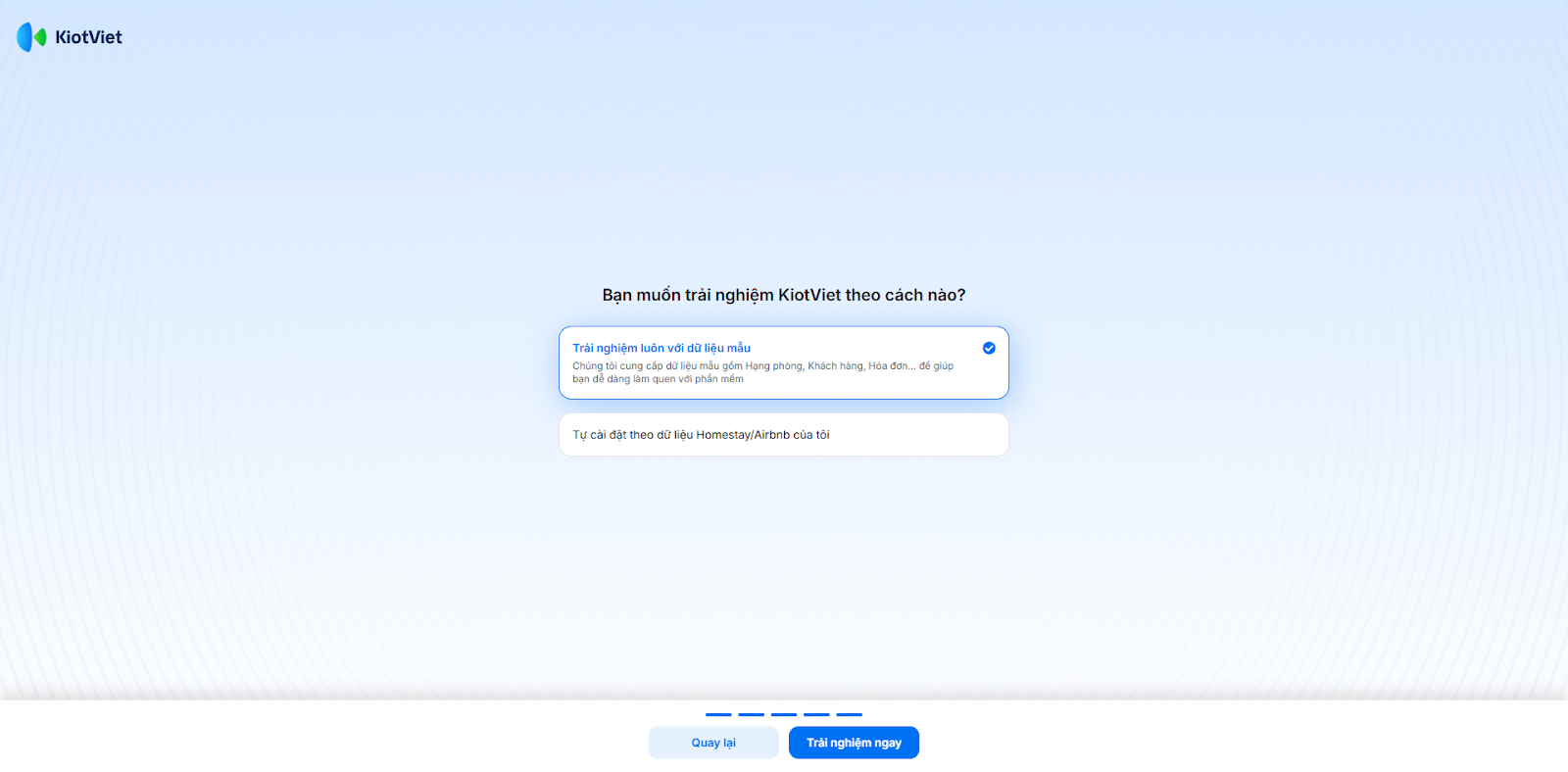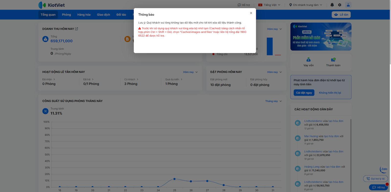 - Hỗ trợ làm quen nhanh: Cung cấp dữ liệu mẫu (phòng, hóa đơn, khách hàng) để trải nghiệm thực tế các tính năng trước khi vận hành chính thức.