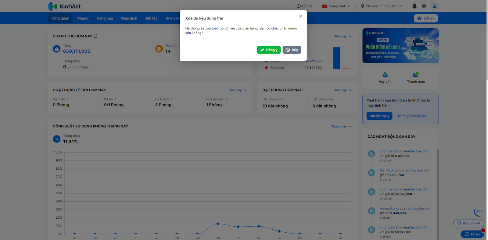 - Khi đã sẵn sàng kinh doanh thực tế, trên màn hình Quản lý, bạn vào Thiết lập → Xóa dữ liệu dùng thử.