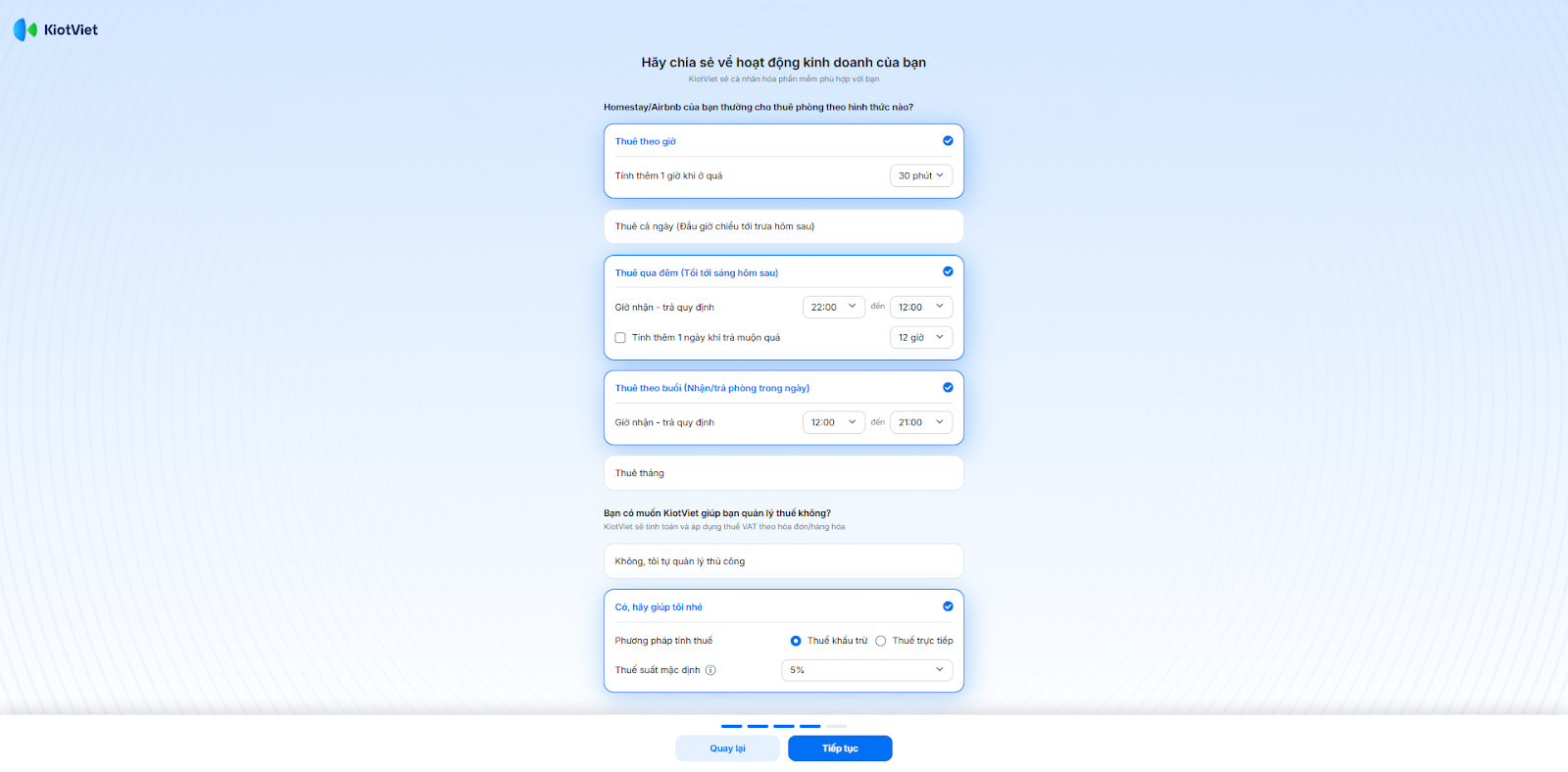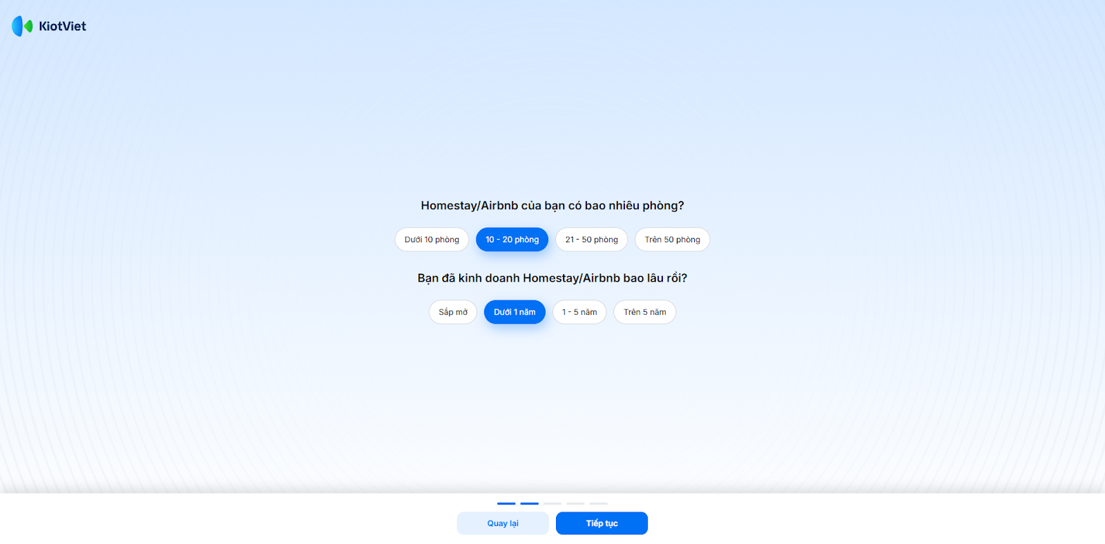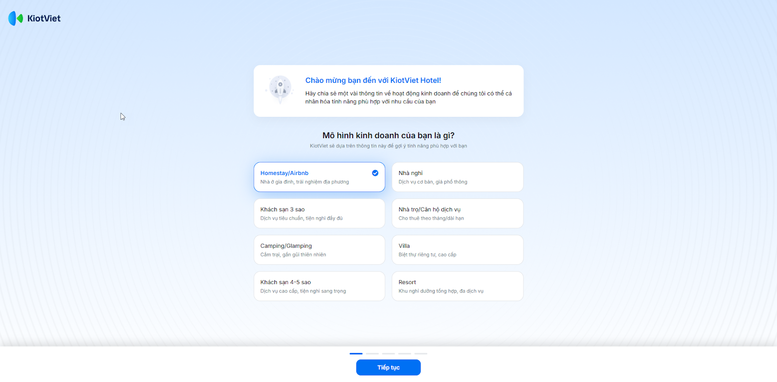 - Chọn số phòng và thời gian kinh doanh → nhấn Tiếp tục.