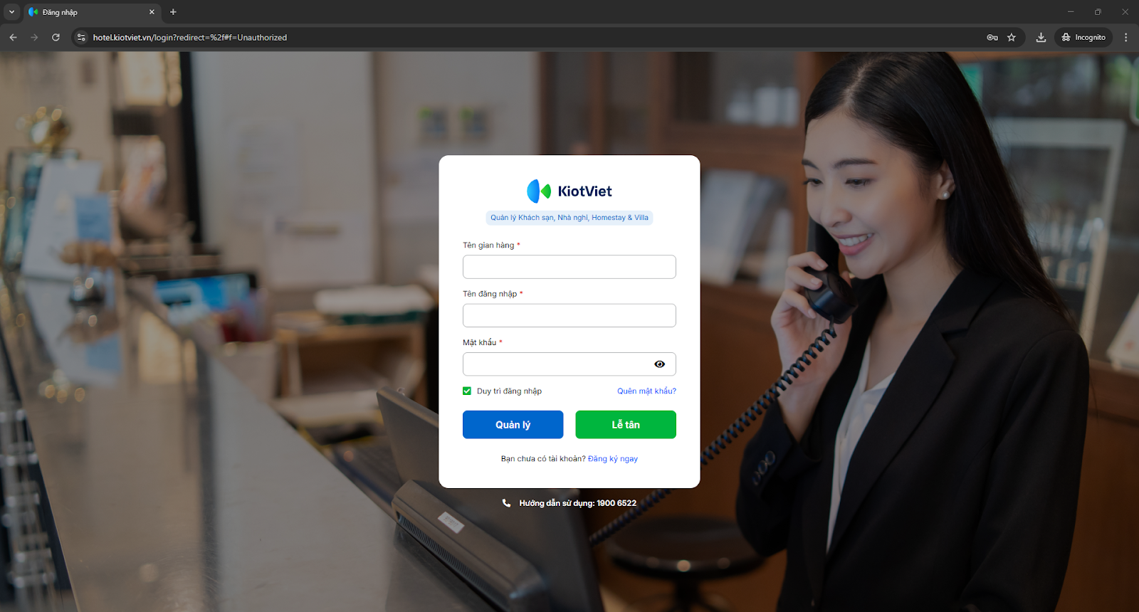 - Tại màn hình đăng nhập, điền Tên gian hàng, Tên đăng nhập và Mật khẩu, sau đó chọn màn hình Quản lý hoặc Lễ tân để bắt đầu làm việc.