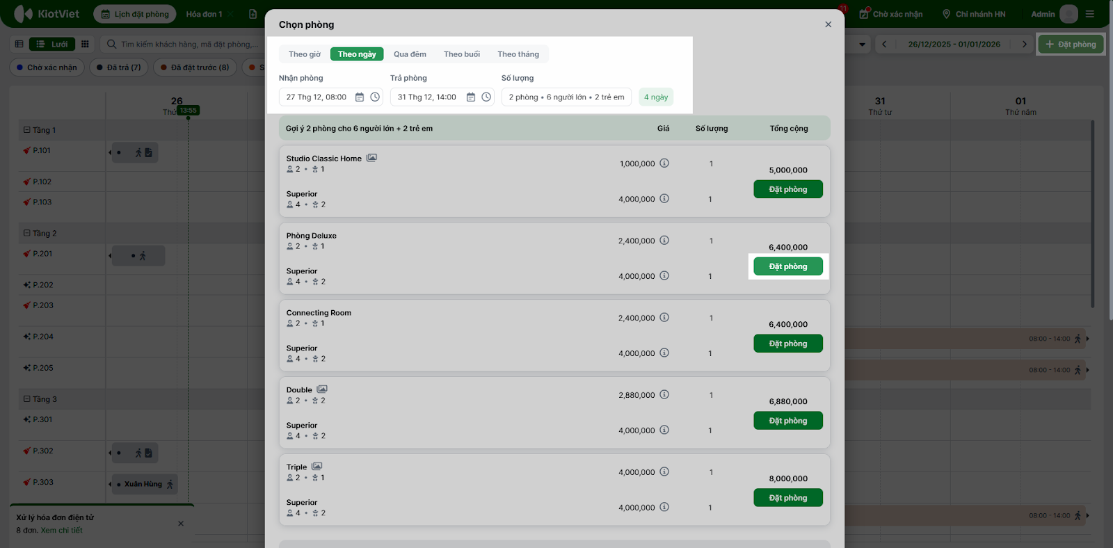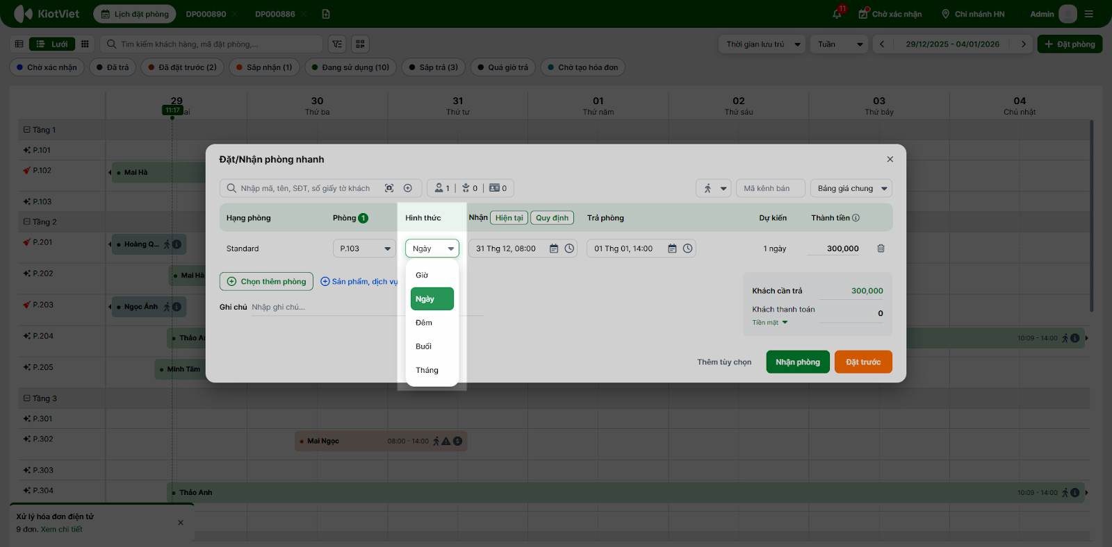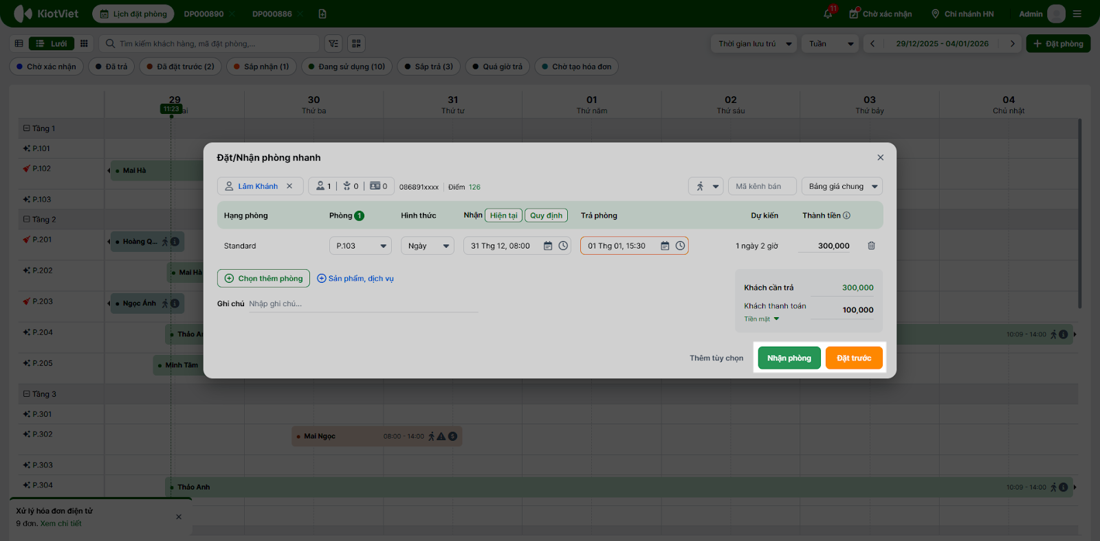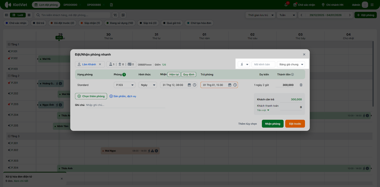 - Bạn chọn vào khoảng trống (dạng lưới) hoặc phòng trống (dạng sơ đồ) → hệ thống mở pop-up Đặt/nhận phòng nhanh.