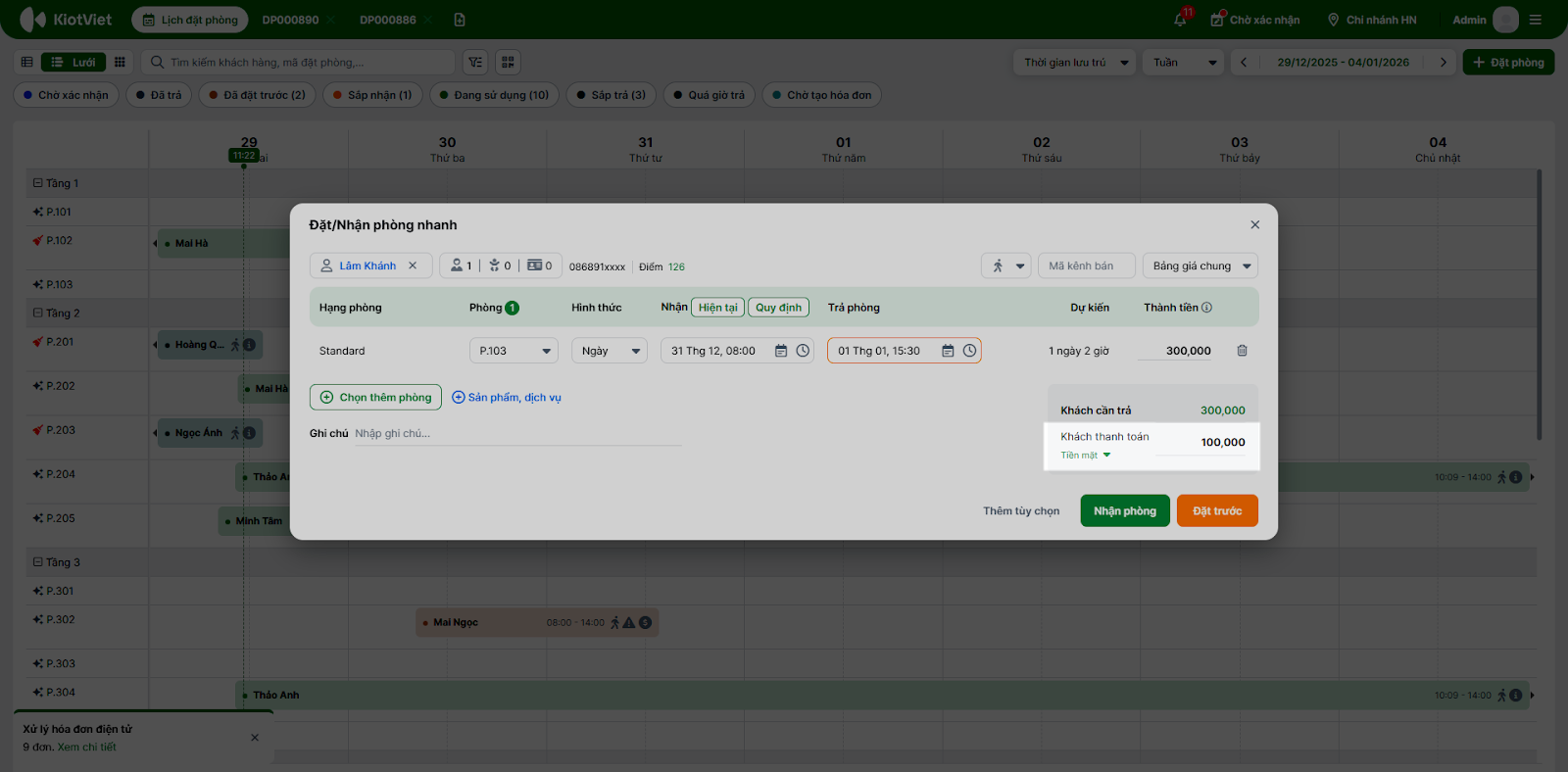 - Ghi nhận đặt cọc (nếu có): Nếu khách hàng có đặt cọc trước, bạn hãy nhập số tiền này vào mục Khách thanh toán. Số tiền này sẽ được ghi nhận và trừ vào tổng hóa đơn cuối cùng.