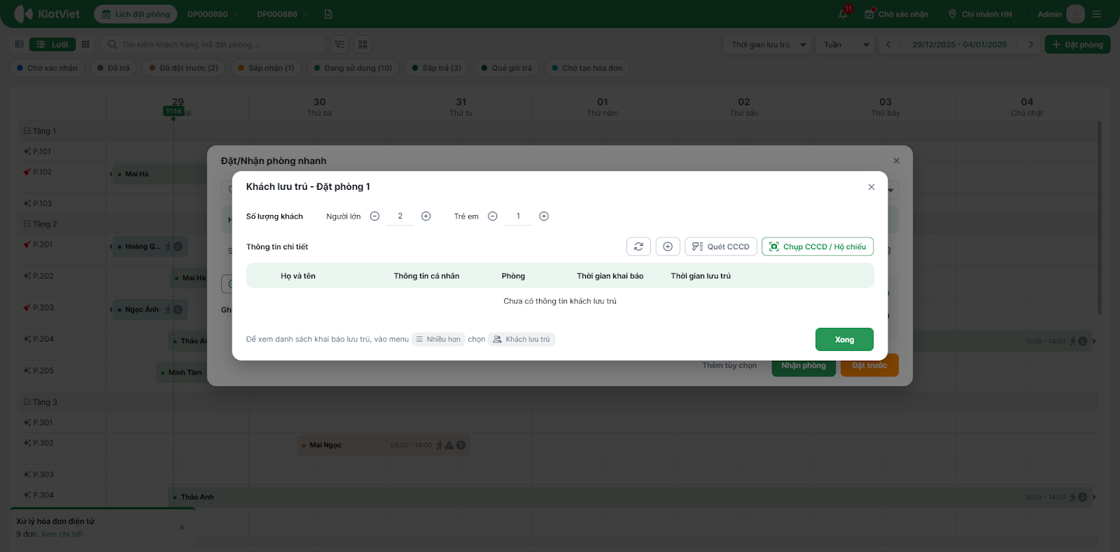 - Nhập thông tin khách lưu trú: Tương tự thông tin khách hàng, bạn có thể sử dụng cá tiện ích Quét CCCD, Chụp CCCD / Hộ chiếu để thêm nhanh thông tin khách lưu trú.