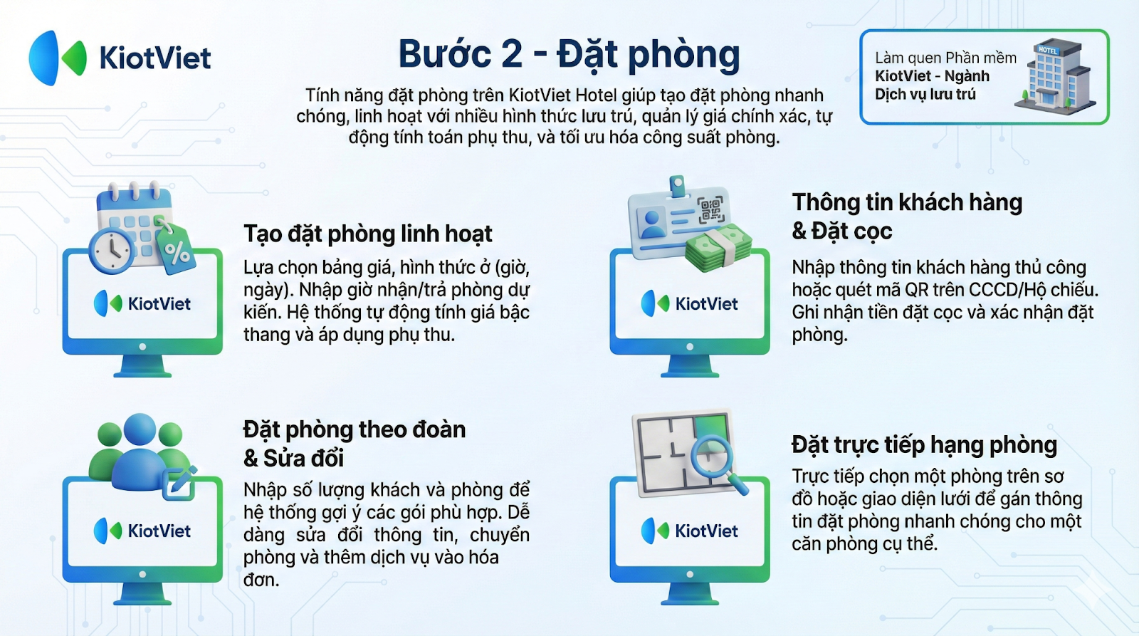 Quy trình đặt phòng là một trong những nghiệp vụ lễ tân cơ bản và quan trọng nhất trên phần mềm KiotViet Hotel. Tính năng này hỗ trợ các thao tác tạo đặt phòng, đặt phòng theo số lượng khách và lựa chọn phòng trực tiếp một cách nhanh chóng, chính xác, giúp lễ tân quản lý hiệu quả lịch trình lưu trú của khách hàng, tối ưu hóa công suất phòng và nâng cao chất lượng dịch vụ.