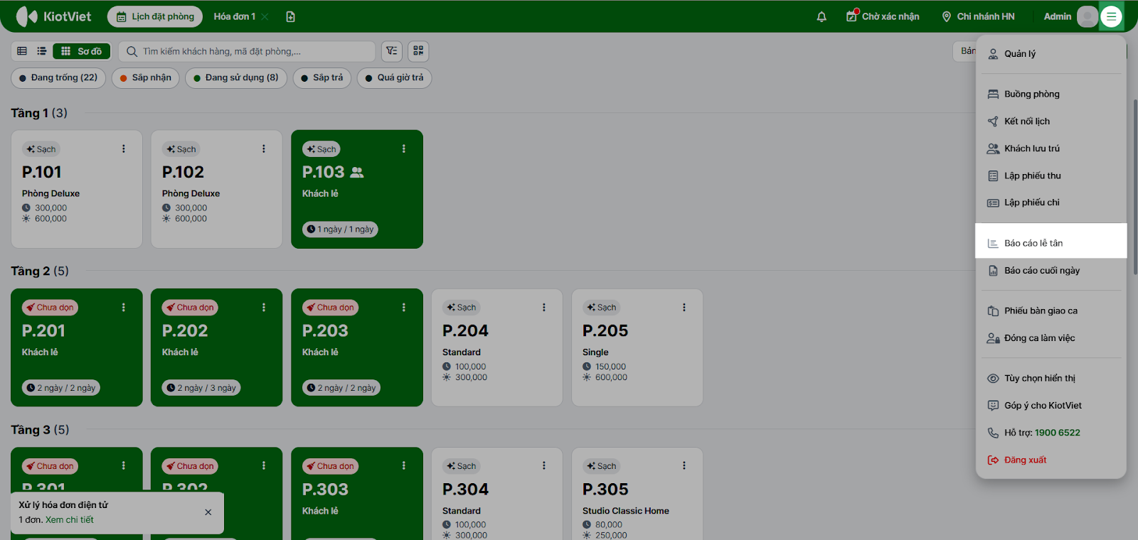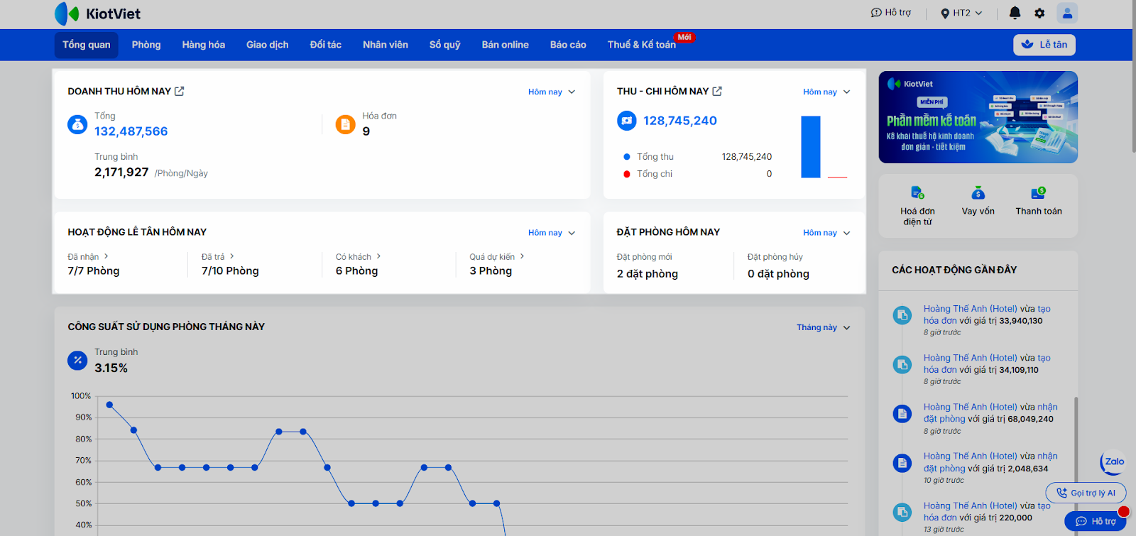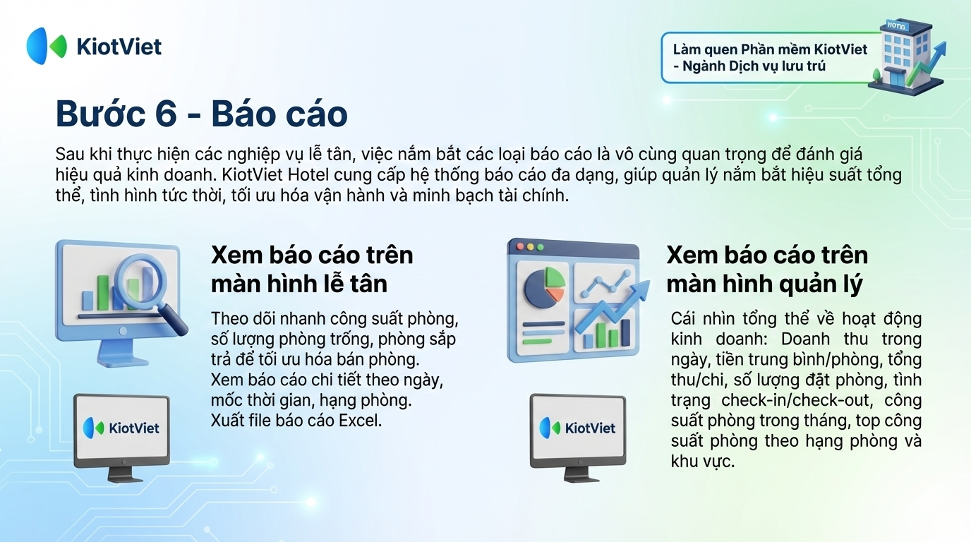 Sau khi thực hiện các nghiệp vụ lễ tân, việc nắm bắt các loại báo cáo là vô cùng quan trọng để đánh giá hiệu quả kinh doanh của khách sạn/nhà nghỉ. KiotViet Hotel cung cấp hệ thống báo cáo đa dạng, từ báo cáo chi tiết cho lễ tân đến cái nhìn tổng quan cho quản lý, giúp bạn đưa ra những quyết định sáng suốt và tối ưu hóa hoạt động kinh doanh.