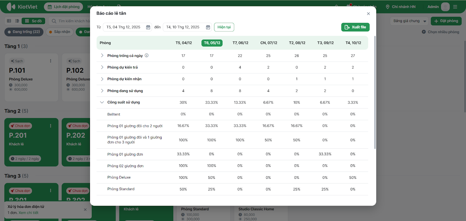 - Tại màn hình này, bạn sẽ thấy thông tin chi tiết về công suất phòng của khách sạn. Bạn có thể xem công suất phòng theo ngày hoặc theo mốc thời gian cụ thể.