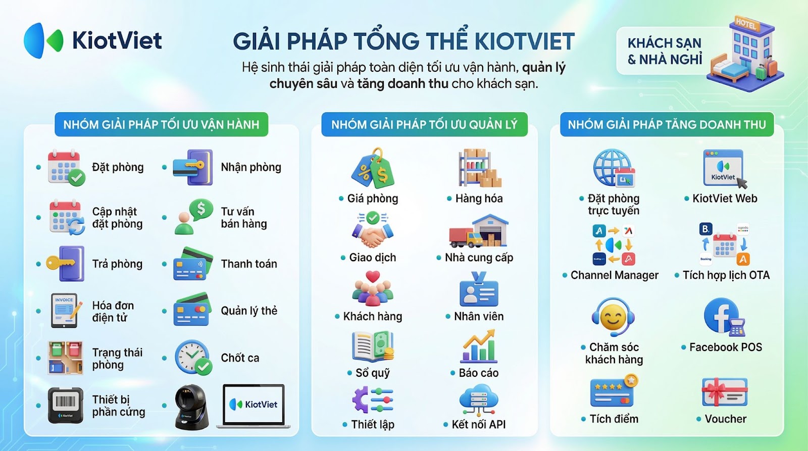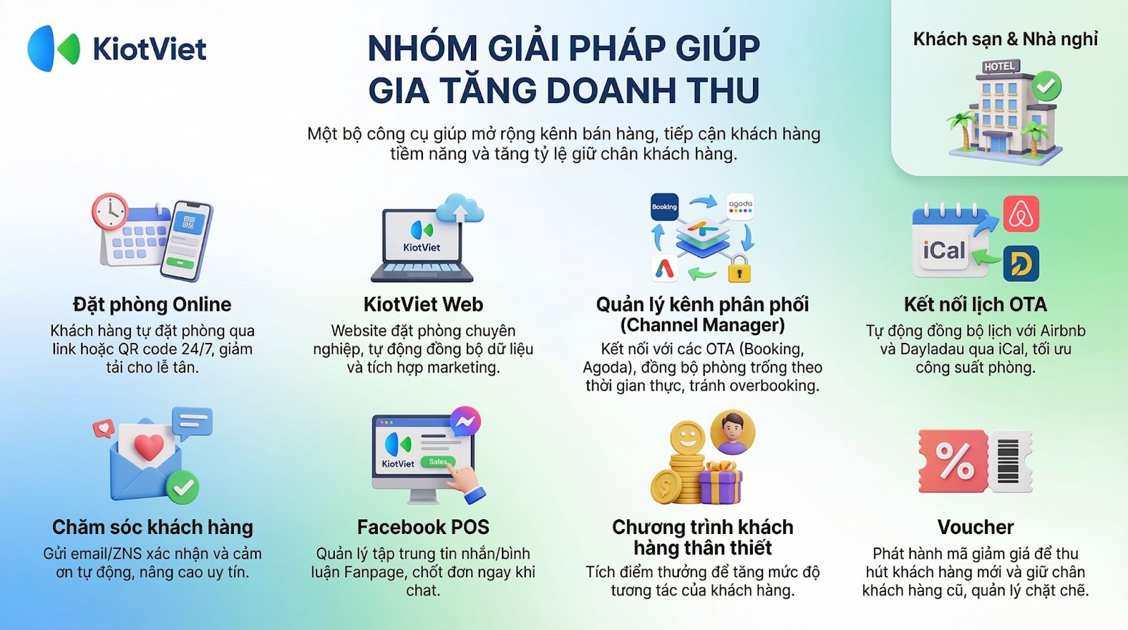 • KiotViet Web: Giúp chủ khách sạn sở hữu website đặt phòng chuyên nghiệp với chi phí thấp, đồng bộ dữ liệu tự động và tích hợp các công cụ marketing hiệu quả.