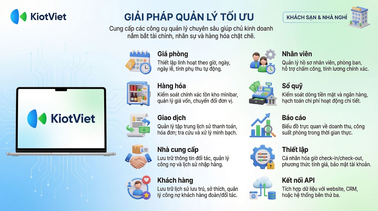 Giải pháp KiotViet Hotel mang đến quy trình quản lý toàn diện từ vận hành, kiểm soát nội bộ đến các công cụ marketing giúp tối ưu hóa doanh thu cho chủ kinh doanh.